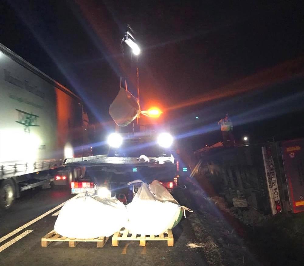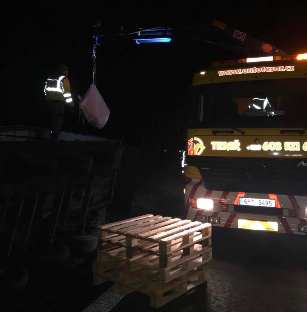 Na místo vyrazili policisté i hasiči, v současné chvíli je silnice přibližně na tři hodiny uzavřena, probíhá překládání nákladu a vyprošťování havarované soupravy.