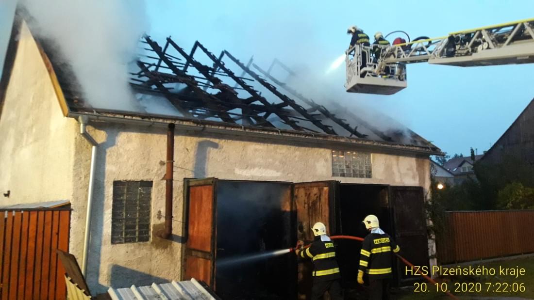 Těsně po páté ráno vyjížděly tři jednotky hasičů do Chodové Plané, kde došlo k požáru dvojgaráže. Hasiči požár zlikvidovali pomocí jednoho C proudu, nasazena ale musela být i výšková technika a k dohašení skrytých ohnisek museli rozebrat střešní konstrukci.