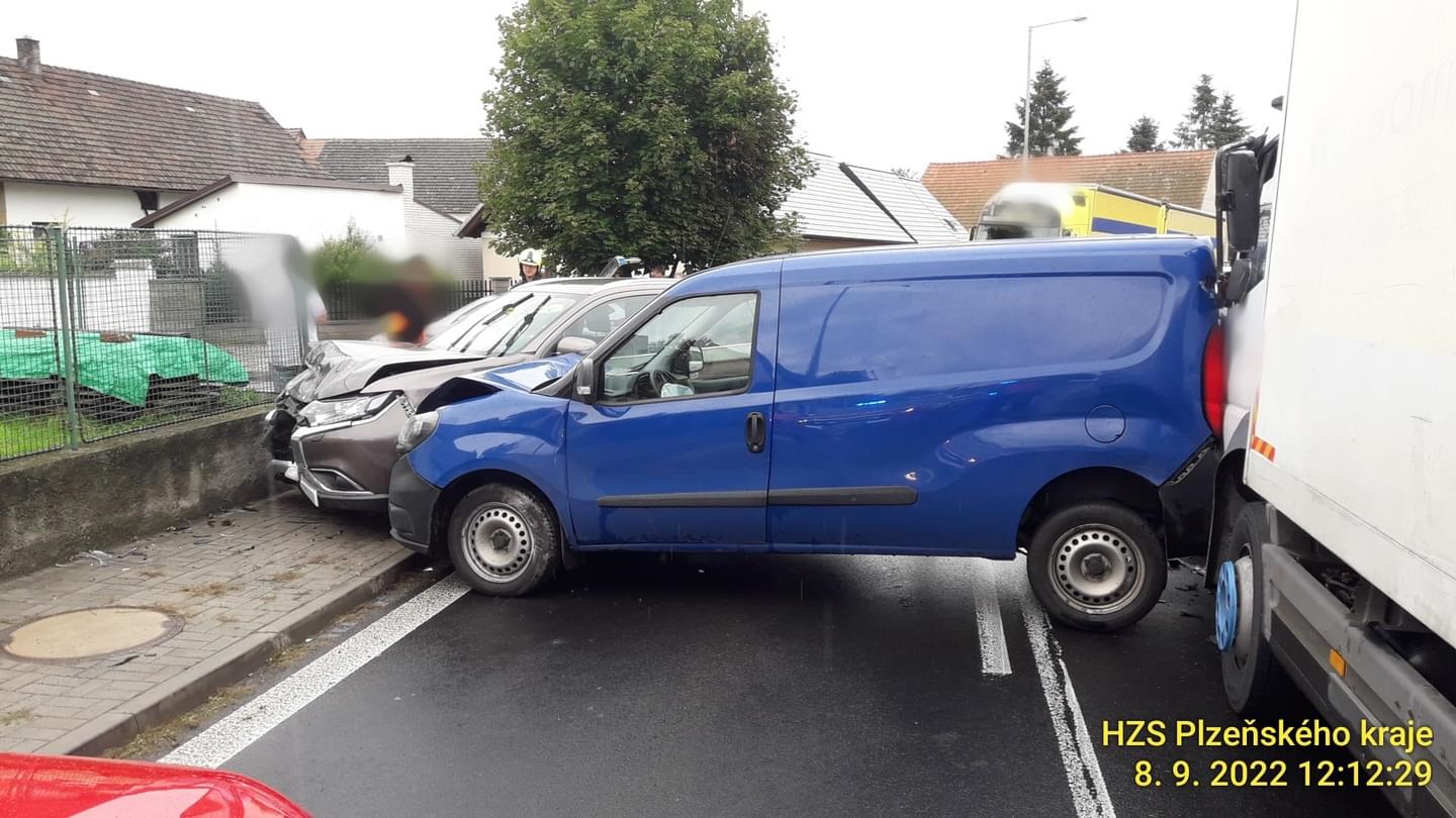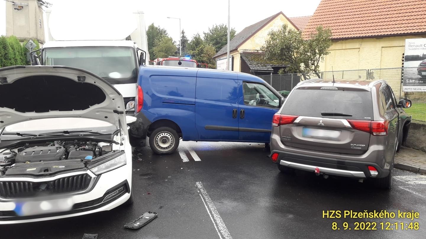 Dnes po poledni došlo na hlavním tahu z Plzně do Klatov v Dehtíně k hromadné dopravní nehodě, při které se střetly čtyři osobní a jedno nákladní vozidlo.