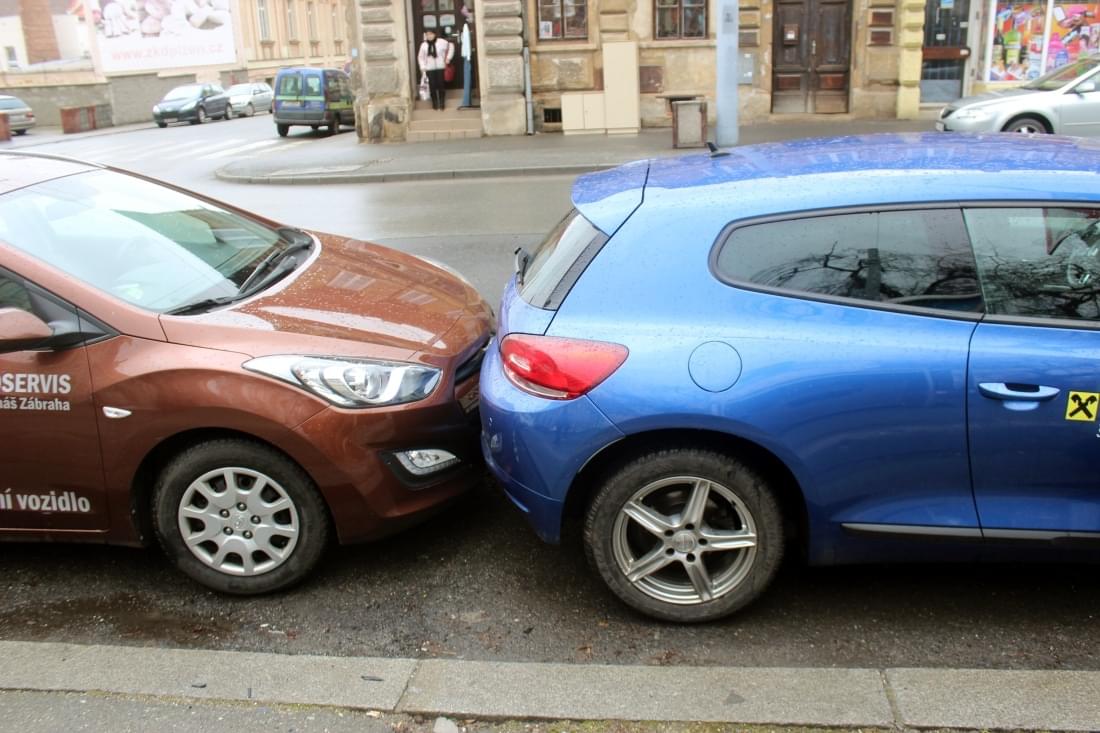 Neovladatelný autobus následně narazil do zaparkovaného vozidla Hyundai, které náraz odhodil na další vozidlo zaparkované v řadě.