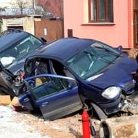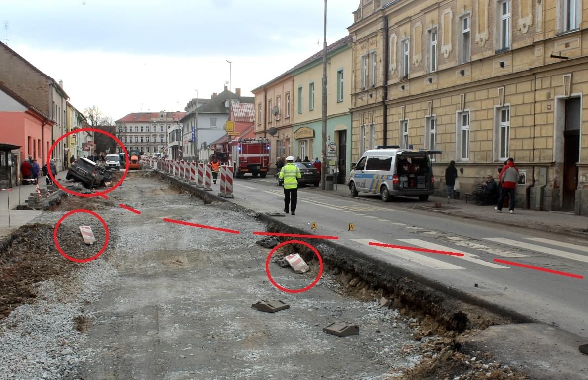 Zde jsme napočítali tři poškozená vozidla. Náraz poslední vozidlo kolony VW Golf, řízené mladou ženou, odhodil pod nákladní auto se dřevem.