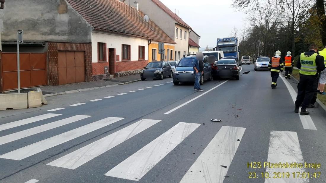 Ke střetu čtyř vozů se sražením chodce vyjely všechny záchranné složky do Přeštic do ulice 1. máje před pátou hodinou odpoledne. Z místa je hlášen zraněný chodec a nehoda blokuje provoz.
