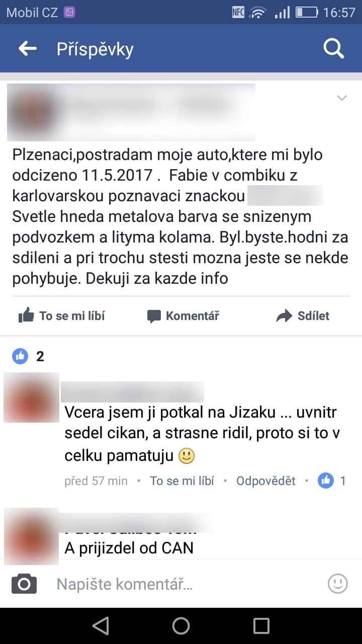 Paní prohledala okolí, zda se nezmýlila a nezaparkovala jinde, a pak celý případ oznámila policii. Následně také na diskuzní skupinu Plzeňáci nasdílela prosbu, zda vůz někdo neviděl, samozřejmě i s popisem svého auta. Díky výrazným markantům vozu jí téměř okamžitě lidé začali hlásit, kde a kdy vůz viděli, včetně toho, že vůz řídí Rom, který ale vůbec řídit neumí. Paní o těchto zjištěních průběžně informovala policii.