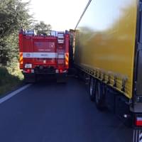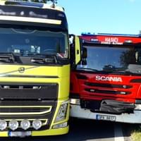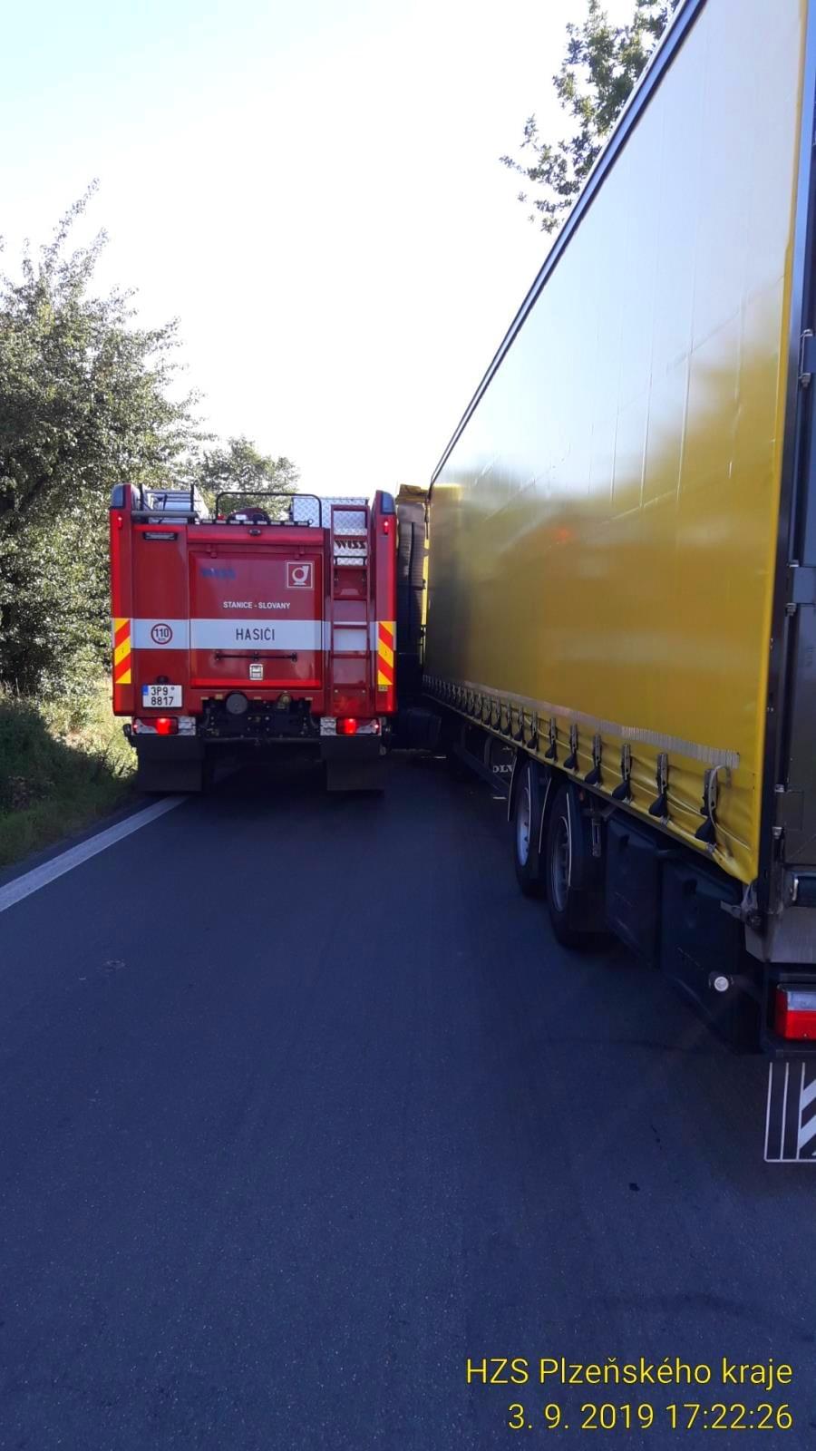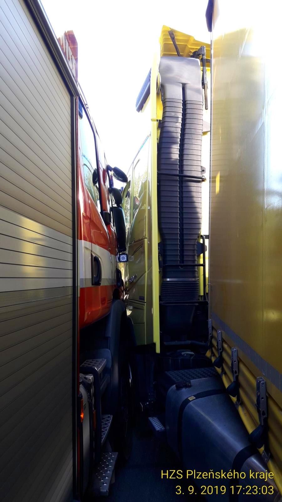 Silnice byla kvůli havárii neprůjezdná a v koloně čekajících automobilů bohužel naprosto nesmyslně zareagoval řidič jednoho z kamionů. Ten totiž z čekající kolony vybočil právě před k zásahu spěchající vůz hasičů. Strojníkovi se naštěstí podařilo mnohatunový stroj ubrzdit i udržet na silnici, úplně ale střetu zabránit nedokázal a došlo k bočnímu střetu s kamionem. Od převrácení do příkopu však hasičskou Scanii dělily pouhé centimetry.