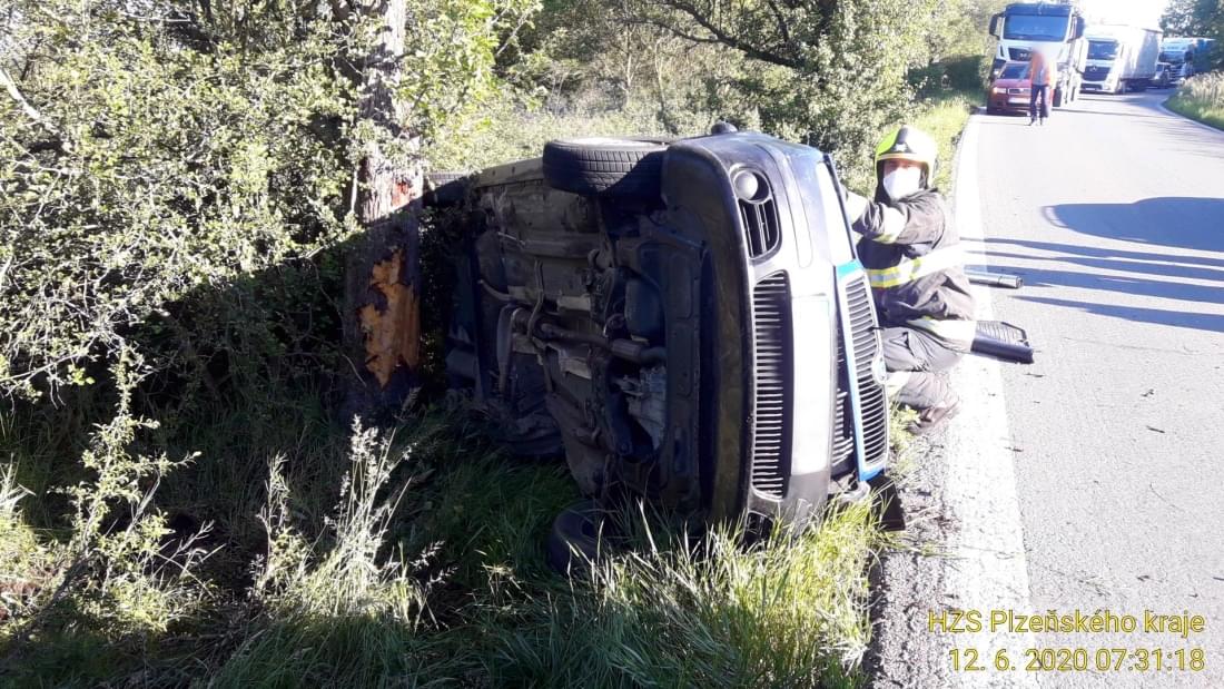 Před půl osmou ráno vyjížděly všechny záchranné složky ke hřbitovu u Starého Plzence, kde při jízdě ve směru k obalovně Letkov došlo k havárii osobního vozidla Škoda Fabia.