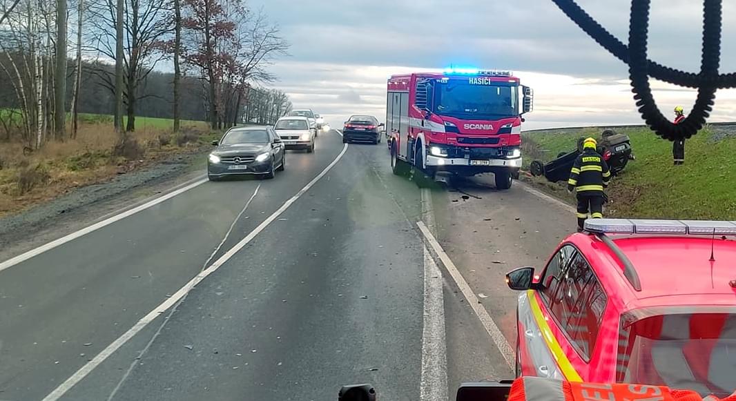 K další nehodě došlo kolem deváté hodiny na hlavním tahu z Plzně na Klatovy na Vysoké u Chlumčan, kde se bočně střetly dva protijedoucí vozy a oba skončily mimo silnici, jeden navíc převrácený na střeše.