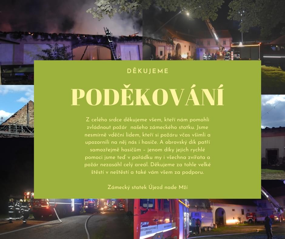 Z celého srdce děkujeme všem, kteří nám pomohli zvládnout požár našeho zámeckého statku. Jsme nesmírně vděčni lidem, kteří si požáru včas všimli a upozornili na něj nás i hasiče. A obrovský dík patří samozřejmě hasičům, jenom díky jejich rychlé pomoci jsme teď v pořádku my i všechna zvířata a požár nezasáhl celý areál.