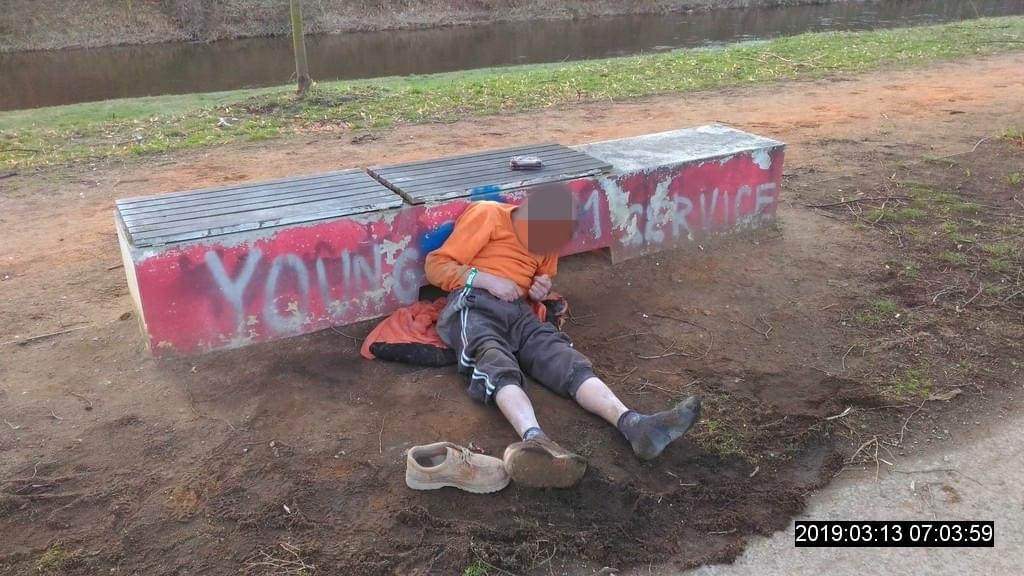 Navzdory nepříznivému počasí ležel na zemi pod lavičkou u lávky pro pěší vedoucí do pivovaru, oblečen pouze do mikiny. Na sobě měl ještě povyhrnuté tepláky a jeho jedna bota se povalovala poblíž. Podchlazený muž jen ležel, třásl se a vůbec s hlídkou nemluvil.