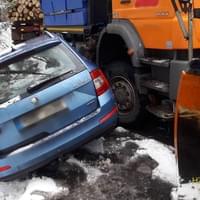 Střet auta, sypače a kamionu se dřevem způsobil několikahodinovou komplikaci v dopravě