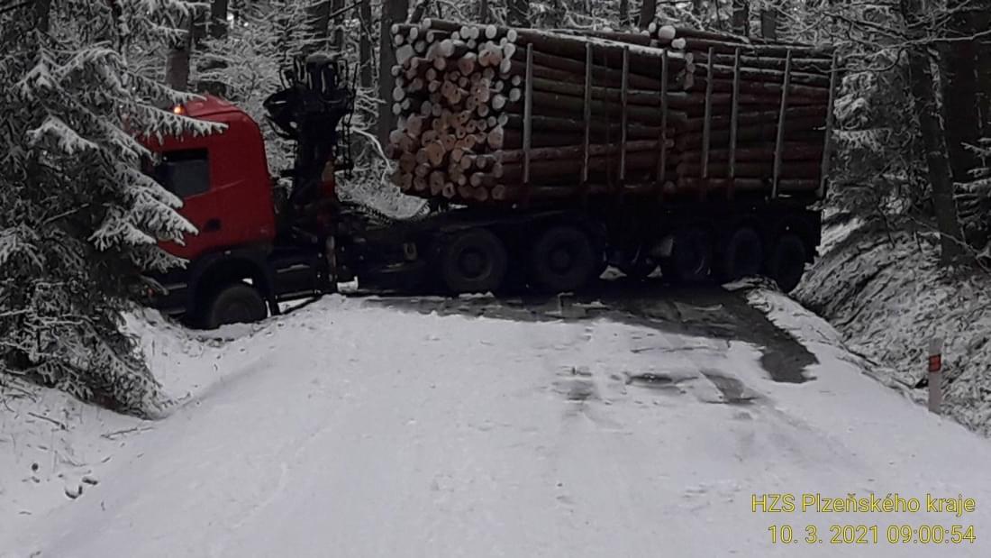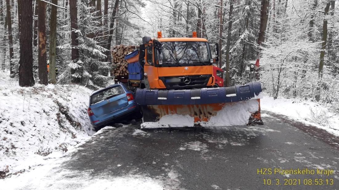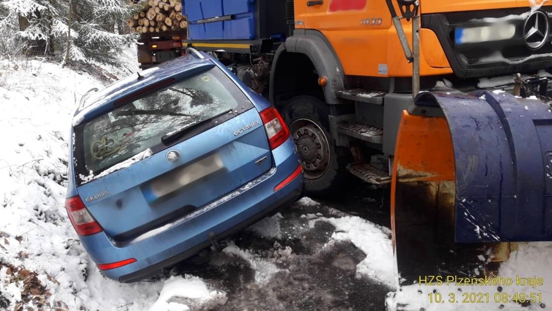 Střet auta, sypače a kamionu se dřevem způsobil několikahodinovou komplikaci v dopravě