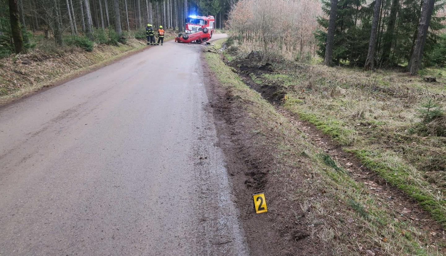 Dnes kolem půl desáté dopoledne došlo na silnici mezi Mýtem a Vejvanovem na úrovni Skomelna k dopravní nehodě, během které mimo silnici vyletělo osobní vozidlo, převrátilo se, dopadlo zpět na vozovku a nakonec zůstalo ležet na střeše.