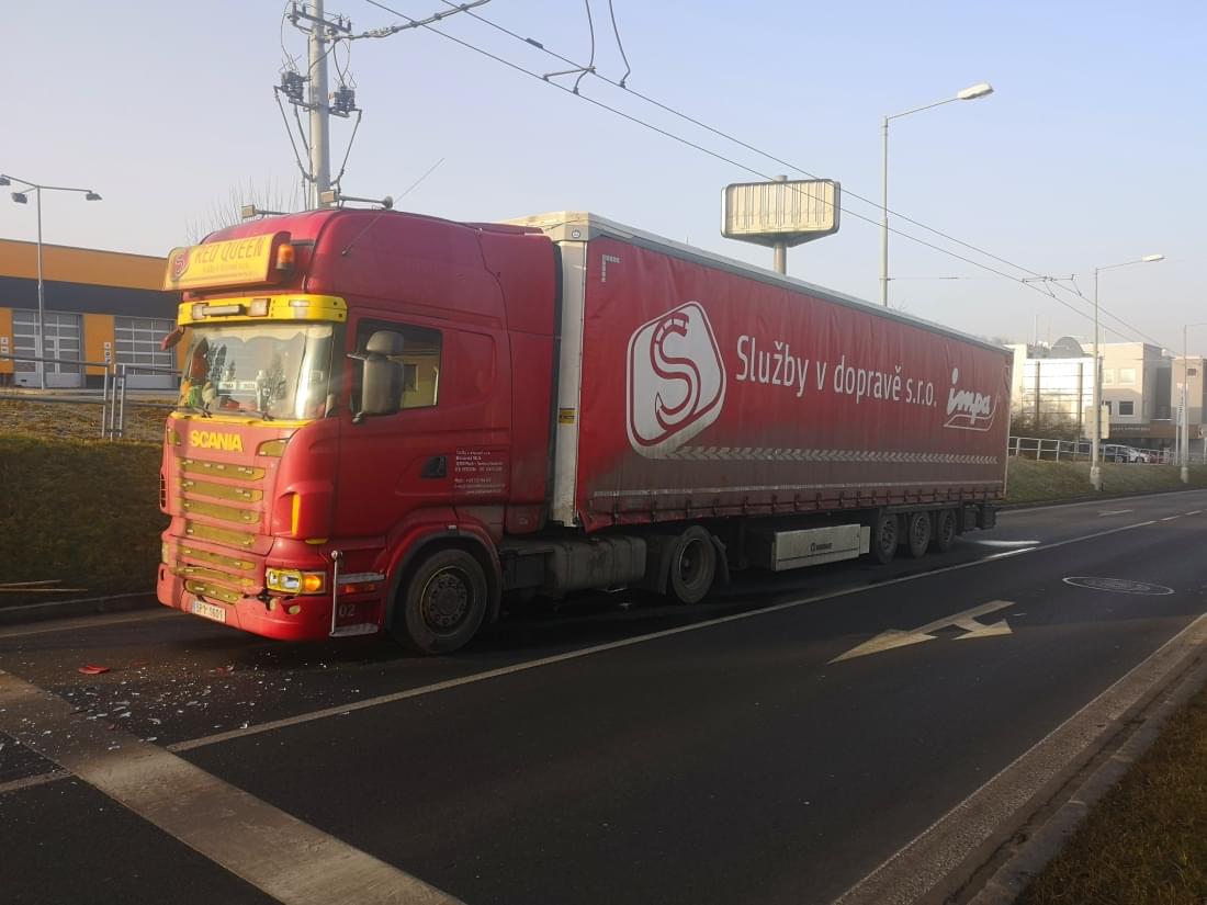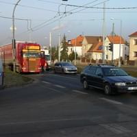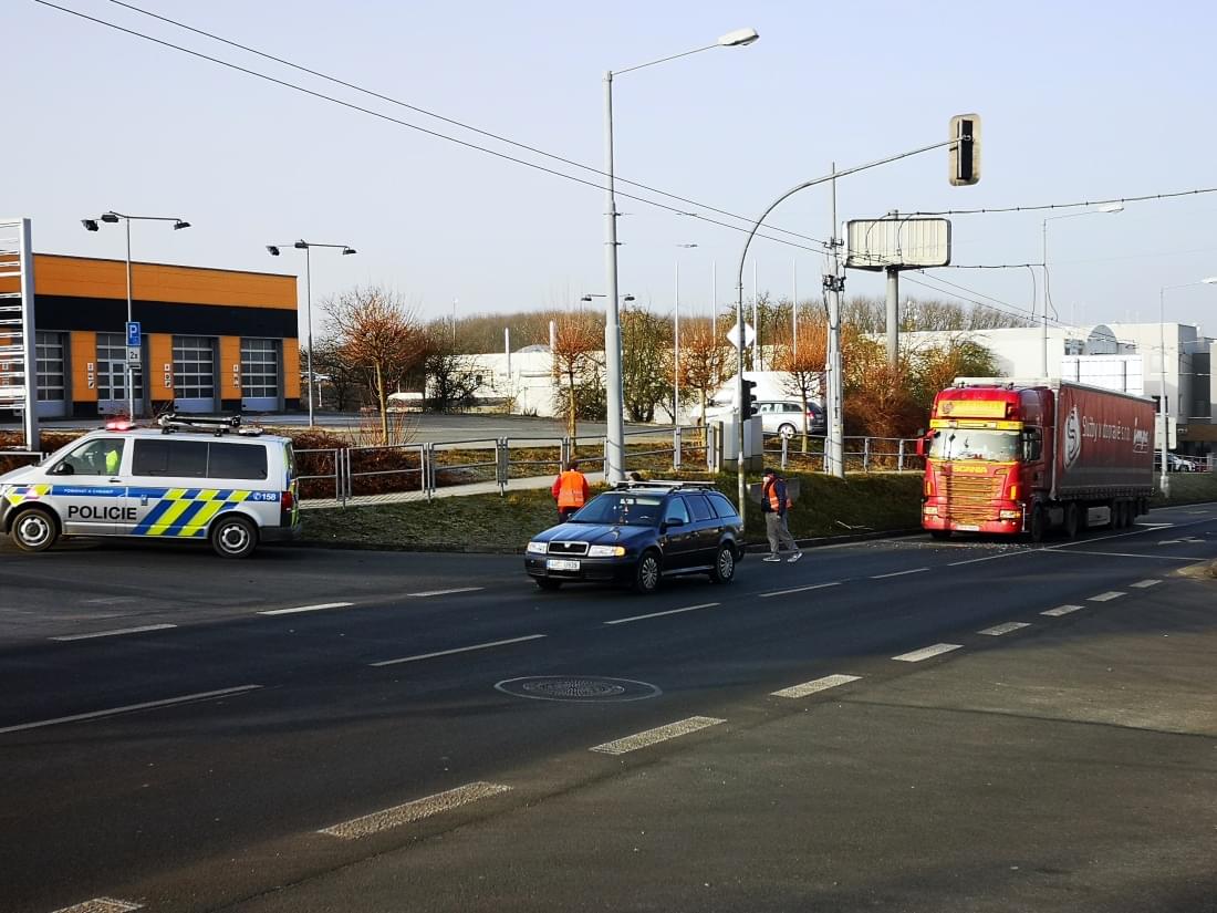 Dnes před osmou hodinou ráno došlo na Rokycanské třídě v Plzni ke střetu kamionu Scania s vozem Škoda.