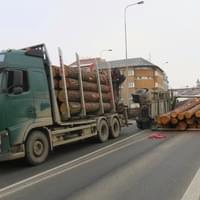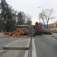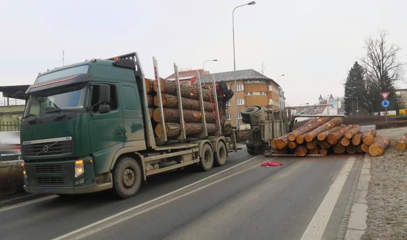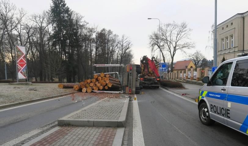 K havárii kamionu se dřevem došlo v pátek 4. března ráno v Klatovech u kruhového objezdu na ulici 5. května ve směru na Luby. "Sedmadvacetiletý muž z obce u Českých Budějovic s nákladním vozidlem značky Volvo s připojeným návěsem, na kterém byl náklad dřevěných klád, projížděl z ulice Tyršova a v půl osmé ráno na kruhovém objezdu odbočoval vpravo do ulice 5. Května. Při odbočení vozidla se převrátil přívěs se dřevem," popsala tisková mluvčí policie s tím, že při dopravní nehodě pádem přívěsu a dřeva byl poškozen ostrůvek a dopravní značka.