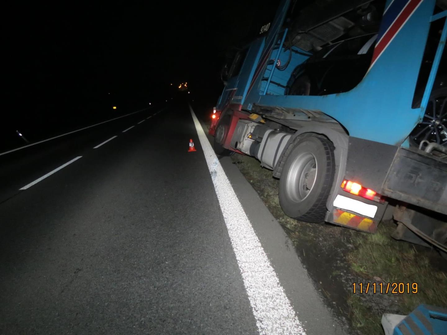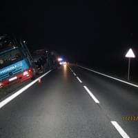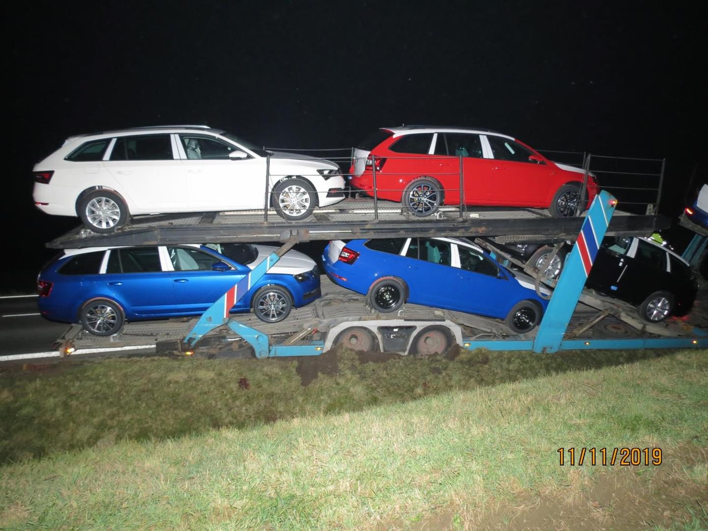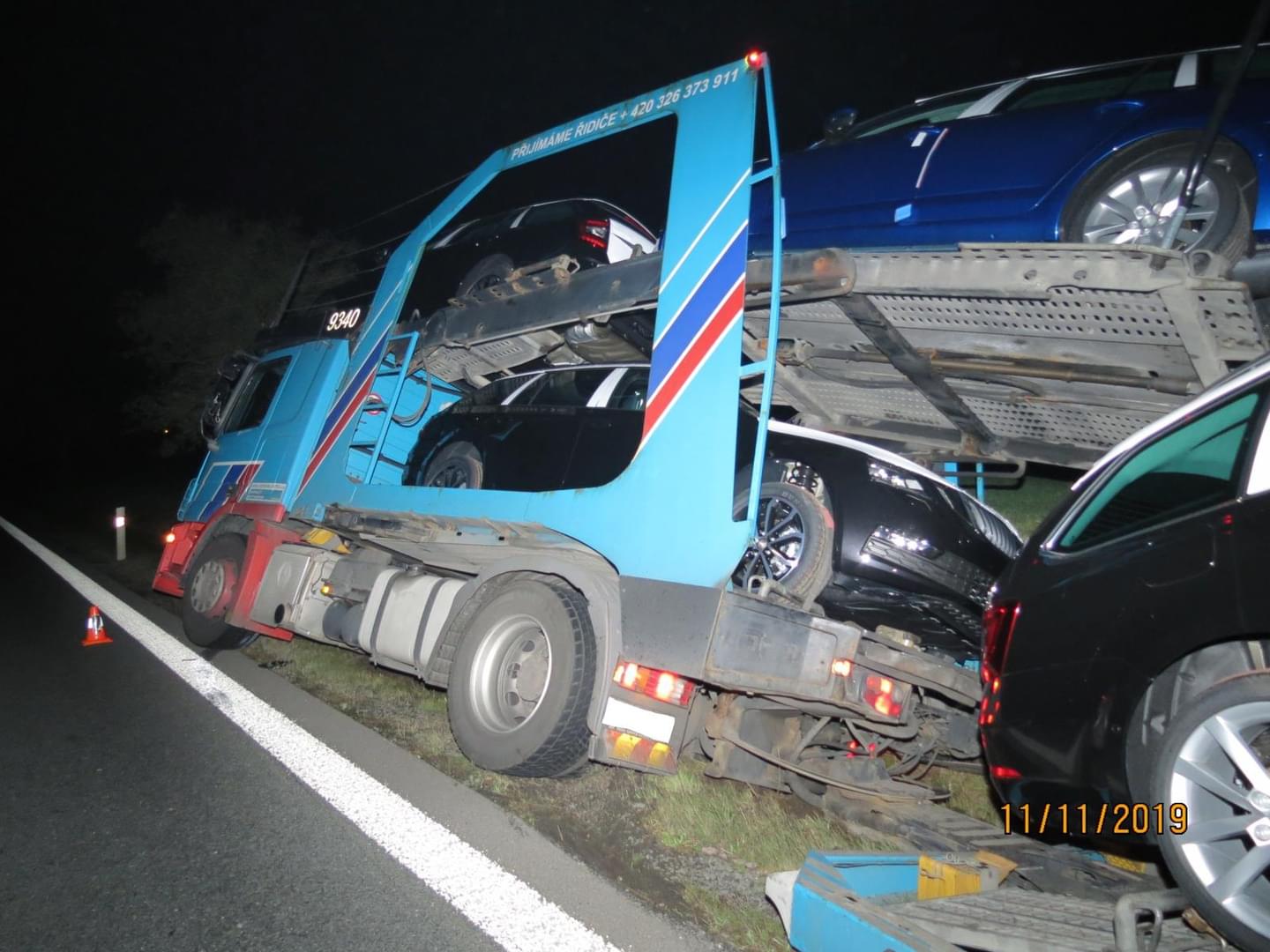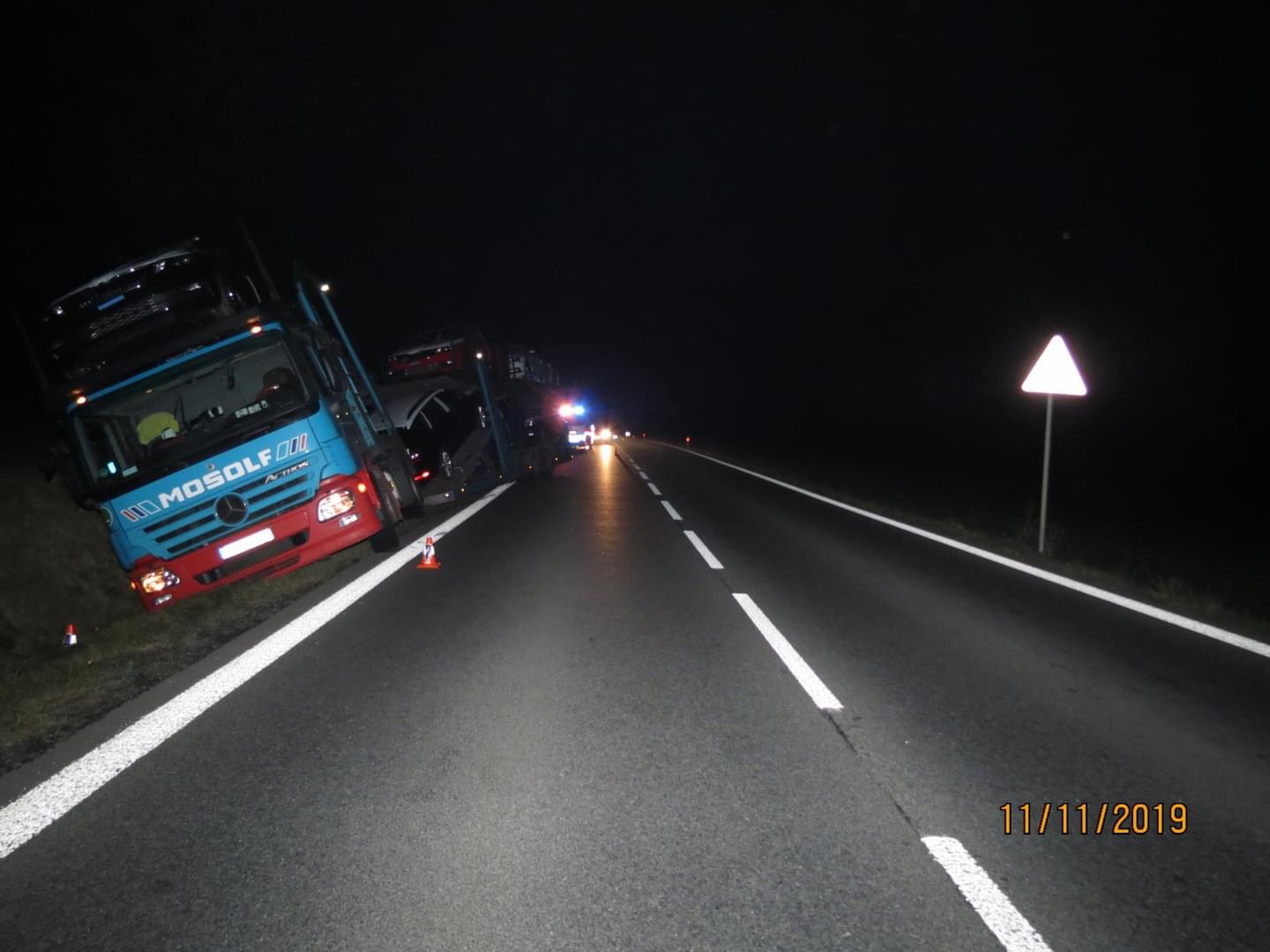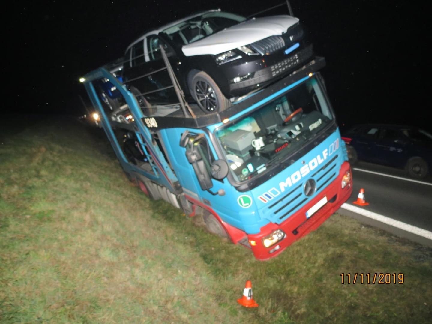 Včera večer v půl šesté došlo na hlavním tahu z Plzně do Domažlic k dopravní nehodě, během níž havaroval do příkopu nákladní vůz Mercedes s přívěsem Lohr naloženým novými vozy.
