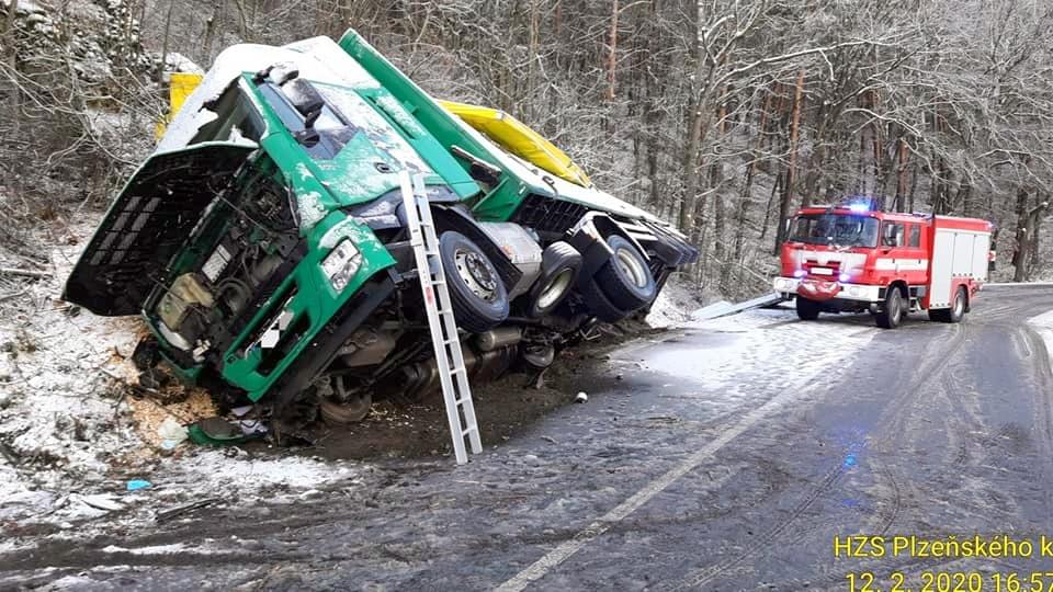 Dnes v půl páté odpoledne došlo na zledovatělé silnici č. I/27 u železničního viaduktu mezi Kokšínem a Švihovem k havárii nákladního automobilu, převážejícího přibližně 30 tun štěpky, do příkopu. Část nákladu se při havárii vysypala.