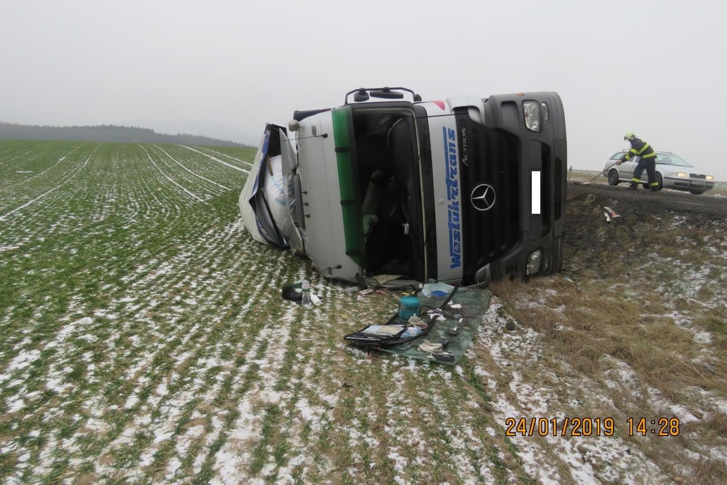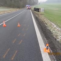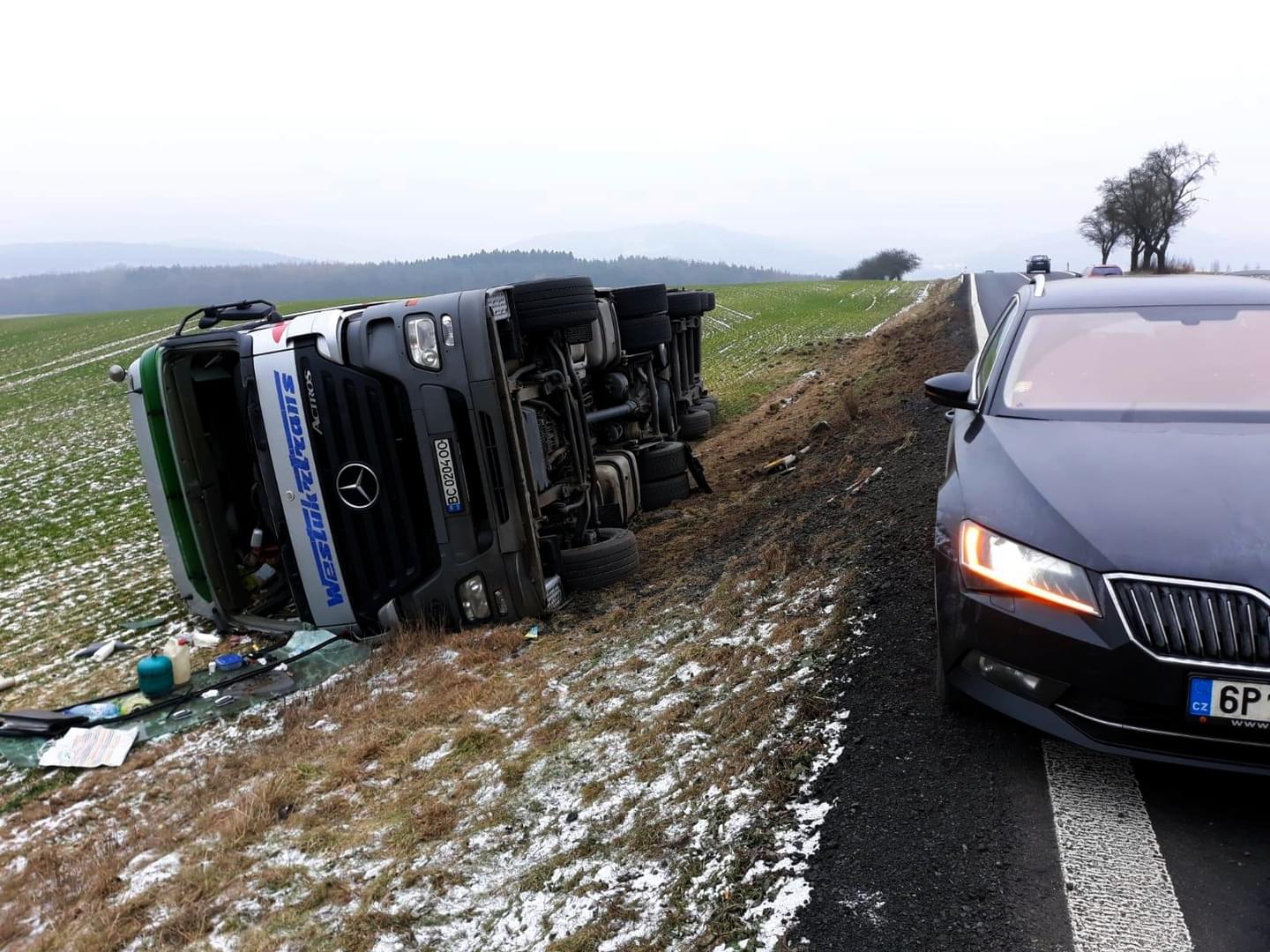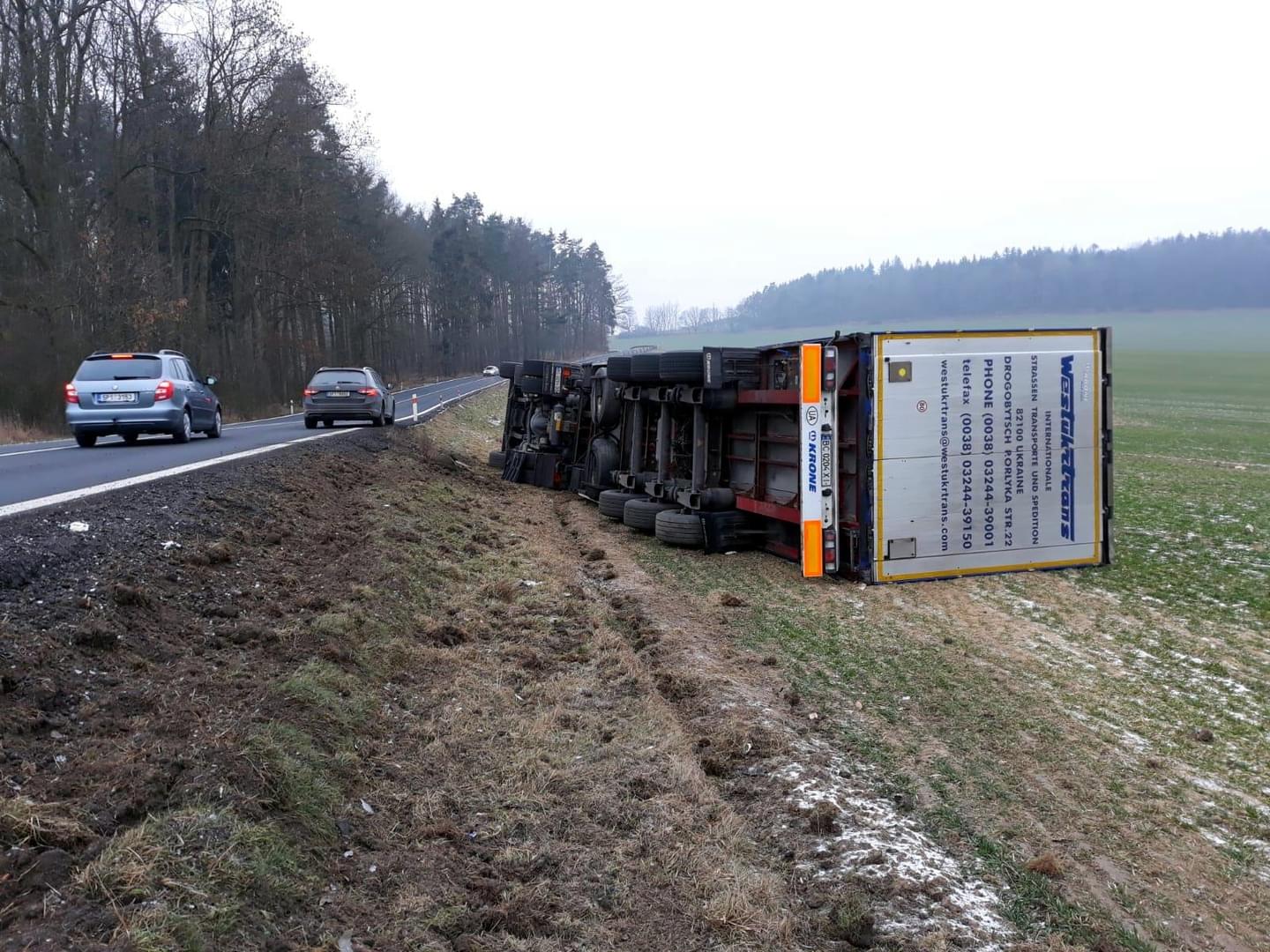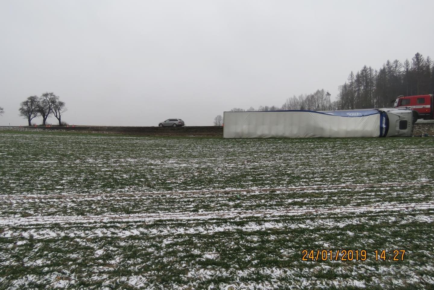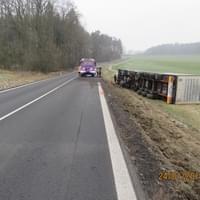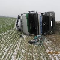 "Jednašedesátiletý řidič náklaďáku najel s vozidlem na krajnici, aby odvrátil bočnímu střetu s neznámým nákladním vozidlem. Krajnice se pod tíhou nákladního vozidla Mercedes utrhla a řidič havaroval vpravo na poli, kde zůstalo vozidlo Mercedes s návěsem ležet na pravé straně. Při najetí vozidla Mercedes vpravo mimo komunikaci došlo k poškození směrového sloupku, kilometrovníku a svršku silničního příkopu," popsala tisková mluvčí policie.