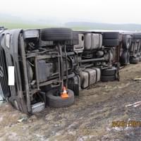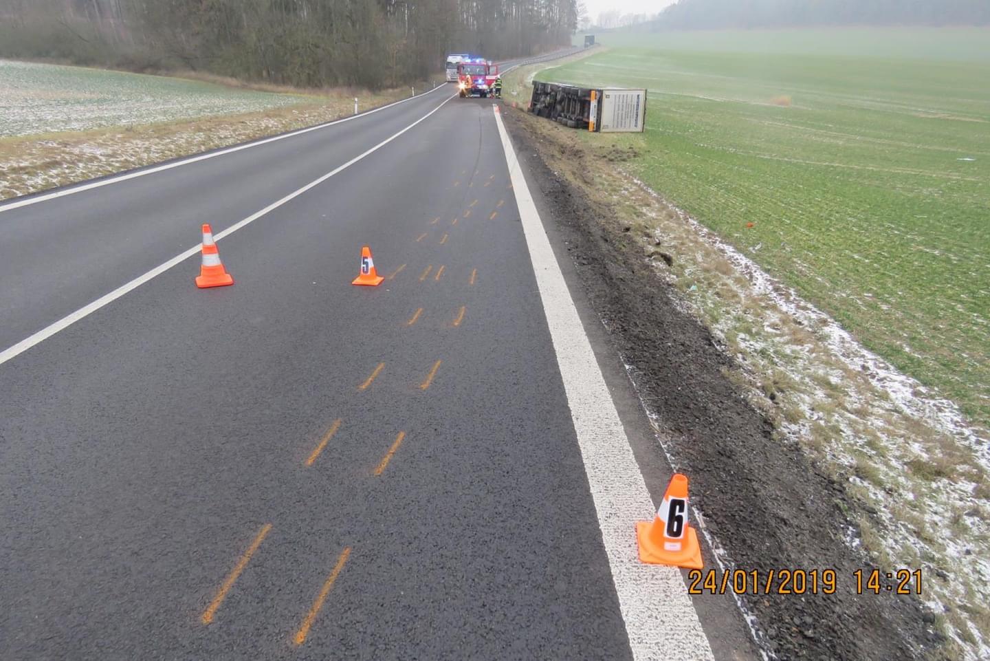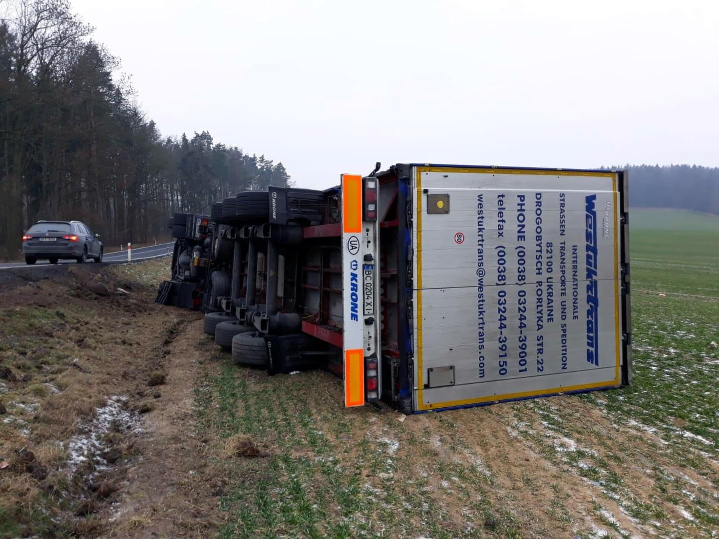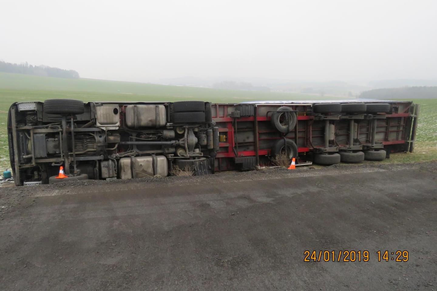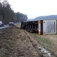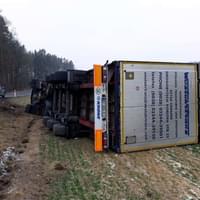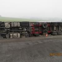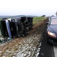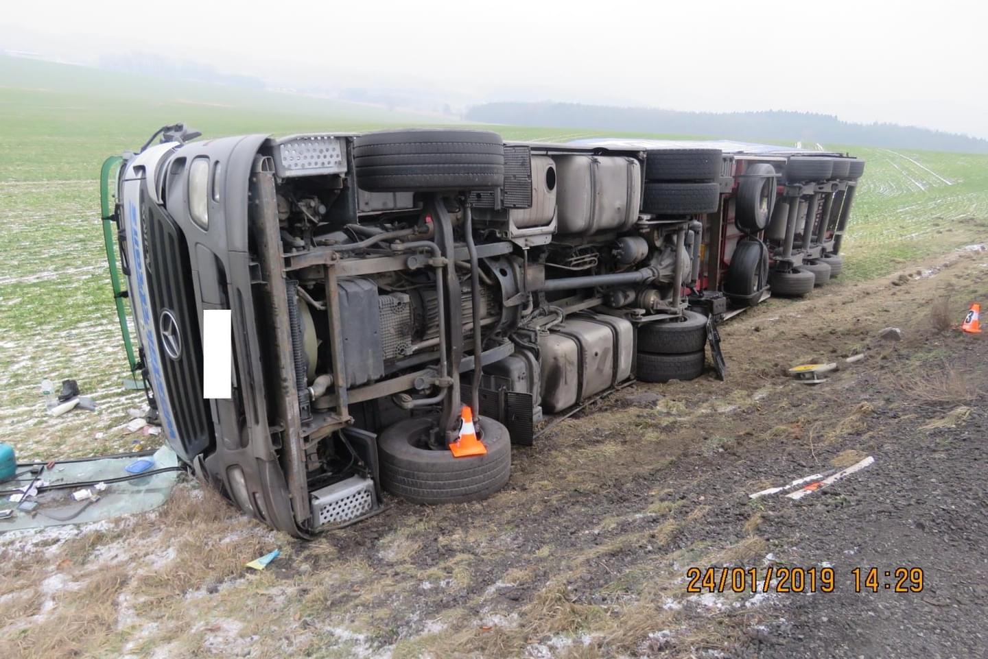 "Jednašedesátiletý řidič náklaďáku najel s vozidlem na krajnici, aby odvrátil bočnímu střetu s neznámým nákladním vozidlem. Krajnice se pod tíhou nákladního vozidla Mercedes utrhla a řidič havaroval vpravo na poli, kde zůstalo vozidlo Mercedes s návěsem ležet na pravé straně. Při najetí vozidla Mercedes vpravo mimo komunikaci došlo k poškození směrového sloupku, kilometrovníku a svršku silničního příkopu," popsala tisková mluvčí policie.