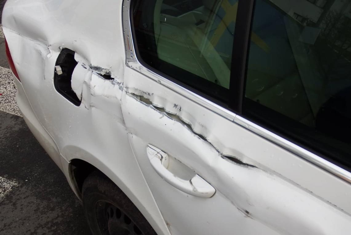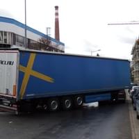 Řidič se však vzdát nechtěl a o nemožné se pokusil. Souprava samozřejmě neměla šanci se do takto ostré zatáčky vejít. Úhel byl natolik velký, že návěs rozmačkal plastovou nástavbu kabiny tahače a poškodil jeden z difuzorů. Bohužel pro ostatní řidiče souprava poškodila několik zaparkovaných vozidel, kdy nejhůře dopadla Škoda Superb a zcela zablokovala ulici.