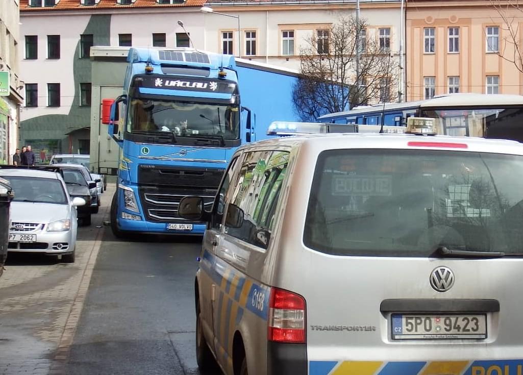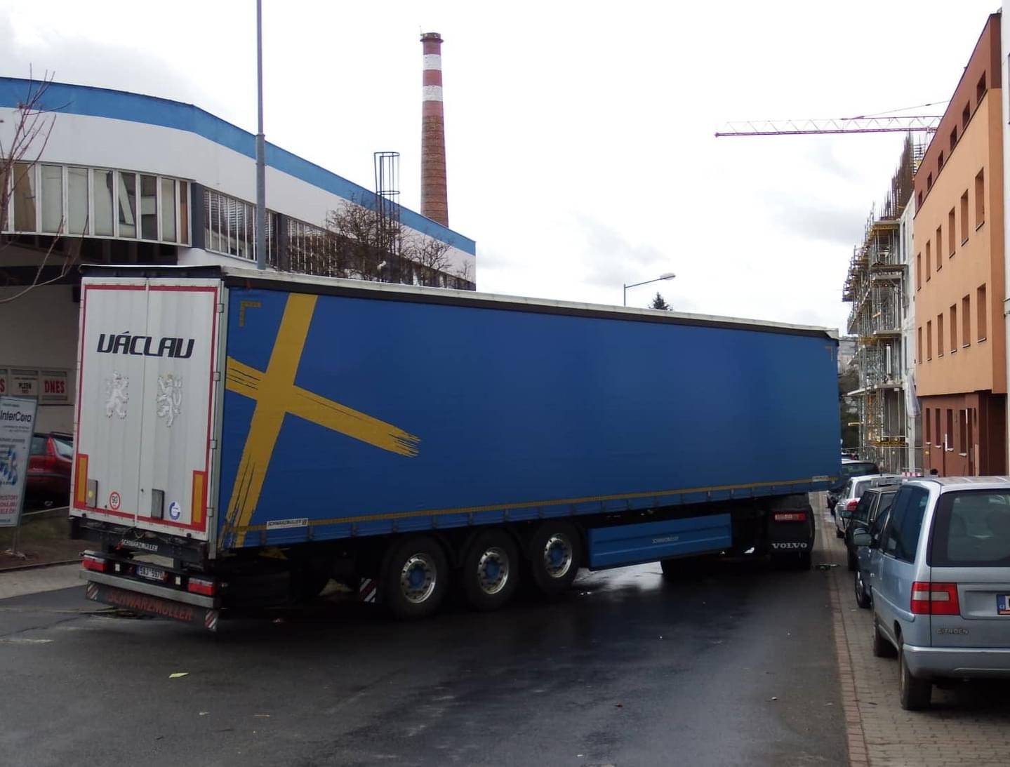 Dnes kolem jedenácté hodiny dopoledne došlo v Papírnické ulici v Plzni k dopravní nehodě více aut. Vše zavinil řidič kamionu Volvo pojmenovaného "Václav".