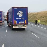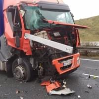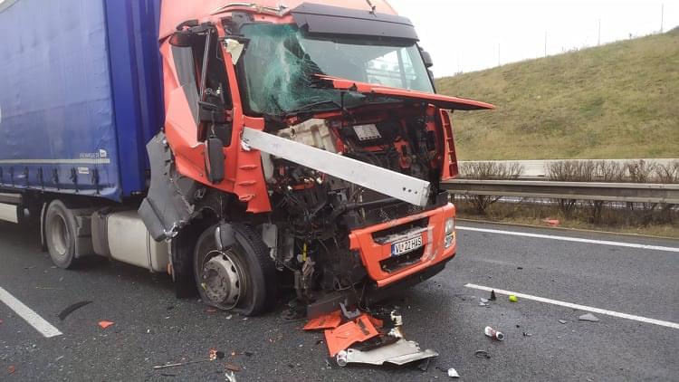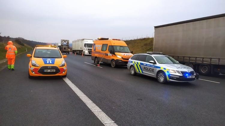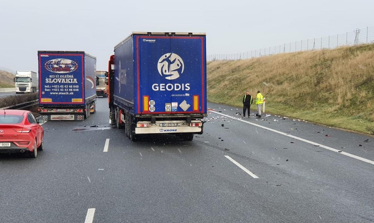 Dnes kolem jedné hodiny odpoledne došlo na 82. kilometru dálnice D5, tedy na obchvatu Plzně, ve směru na Prahu, nedaleko sjezdu na Klatovy ke střetu dvou kamionů.