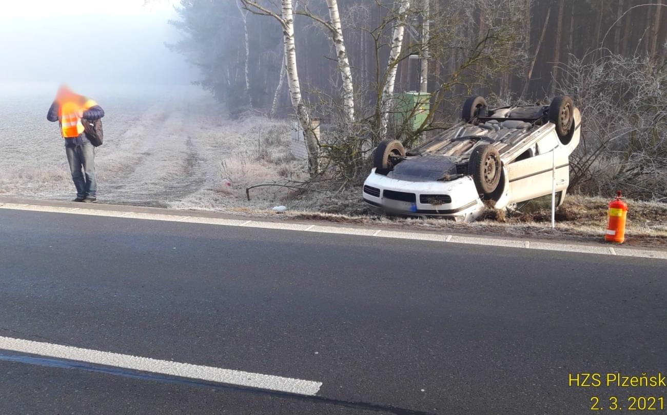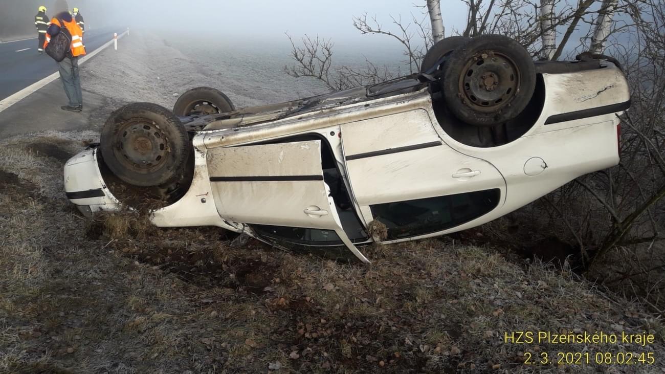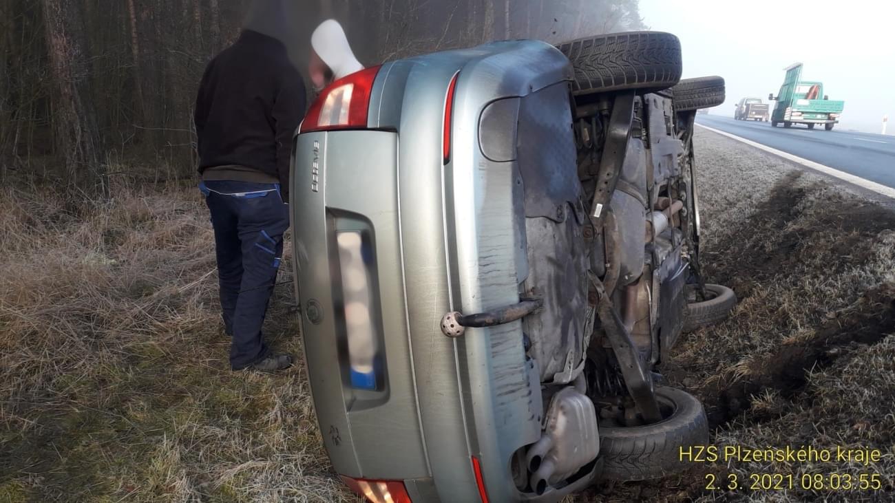 Dnes před osmou hodinou ráno došlo na hlavním tahu z Plzně na Most, za Kralovicemi mezi Vysokou Libyní a Hubenovem k havárii osobního vozu Škoda Octavia, který se po vyjetí za silnice převrátil na střechu.