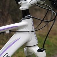 Kolo je bílé barvy s fialovým pruhem a fialovým nápisem, má na sobě fialový držák na pití značky BTWIN, tachometr Sigma a samolepku Ramala Šilhavý.