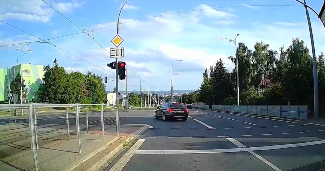 Čtenář jedoucí směrem do centra po Karlovarské na této frekventované křižovatce zastavil v odbočovacím pruhu na červenou a čekal, až bude moci odbočit vlevo do Aleje Svobody. Jiný názor měl zřejmě řidič BMW jedoucího stejným směrem, který bez váhání z průběžného pruhu odbočil vlevo přes odbočovací pruh, tramvajovou trať i několik protisměrných pruhů a dle všeho ho vůbec netrápilo, že auta ze směru od centra mají zelenou.