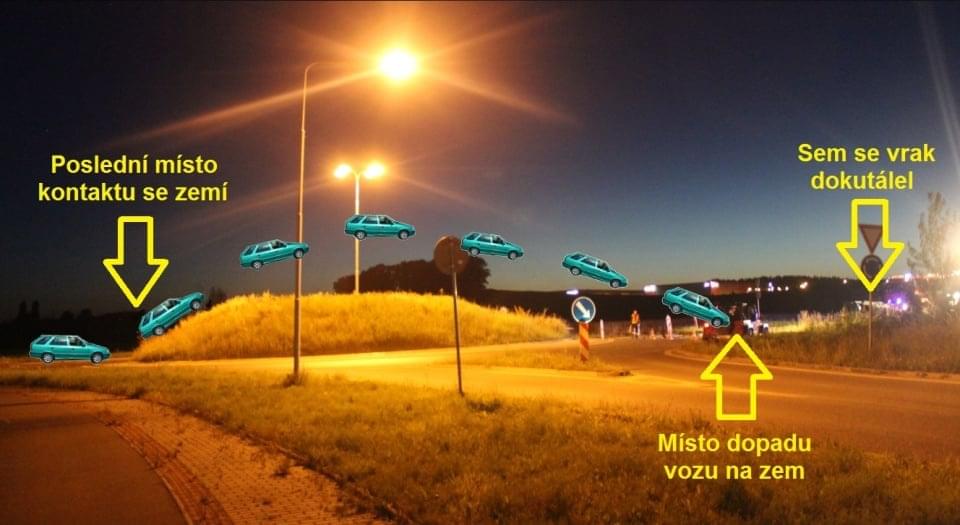 Zatím nejhorší nehoda, kterou jsme zde viděli, byla v roce 2016. V půl desáté večer jsem velikou rychlostí přijela Škoda Forman a řidič v plné rychlosti bez jakéhokoli brzdění vjel na vysoký násep uprostřed kruhového objezdu. Forman se vznesl, celý kopeček doslova přeletěl aniž by se ho dotkl a vozidlo dopadlo až na silnici několik metrů za kopeček. Vzdálenost mezi místem „startu“ a dopadem je tedy více 20 metrů!
