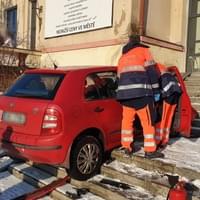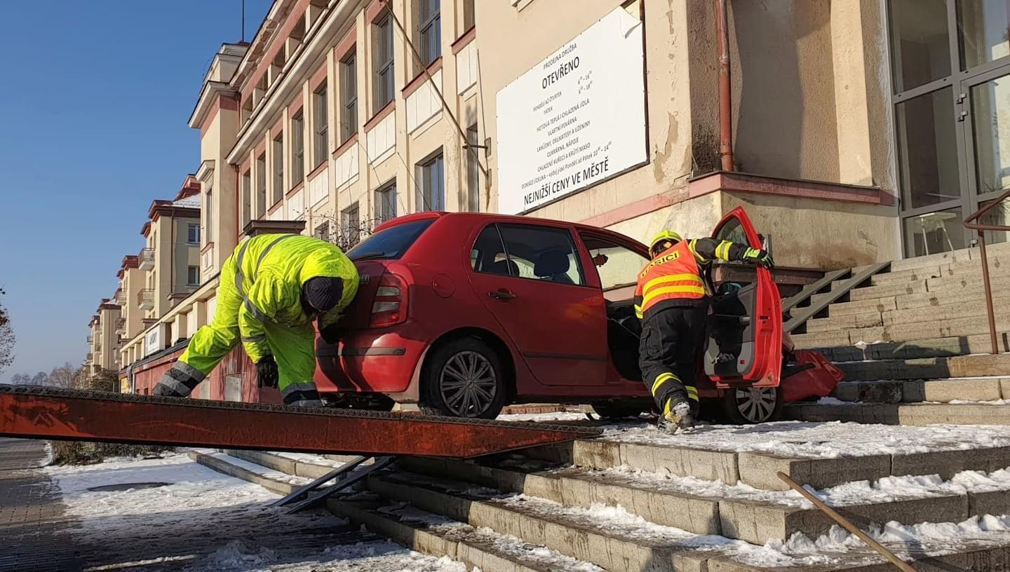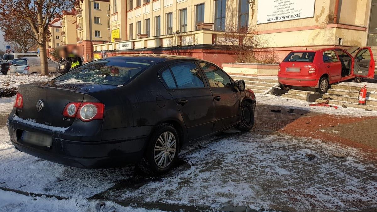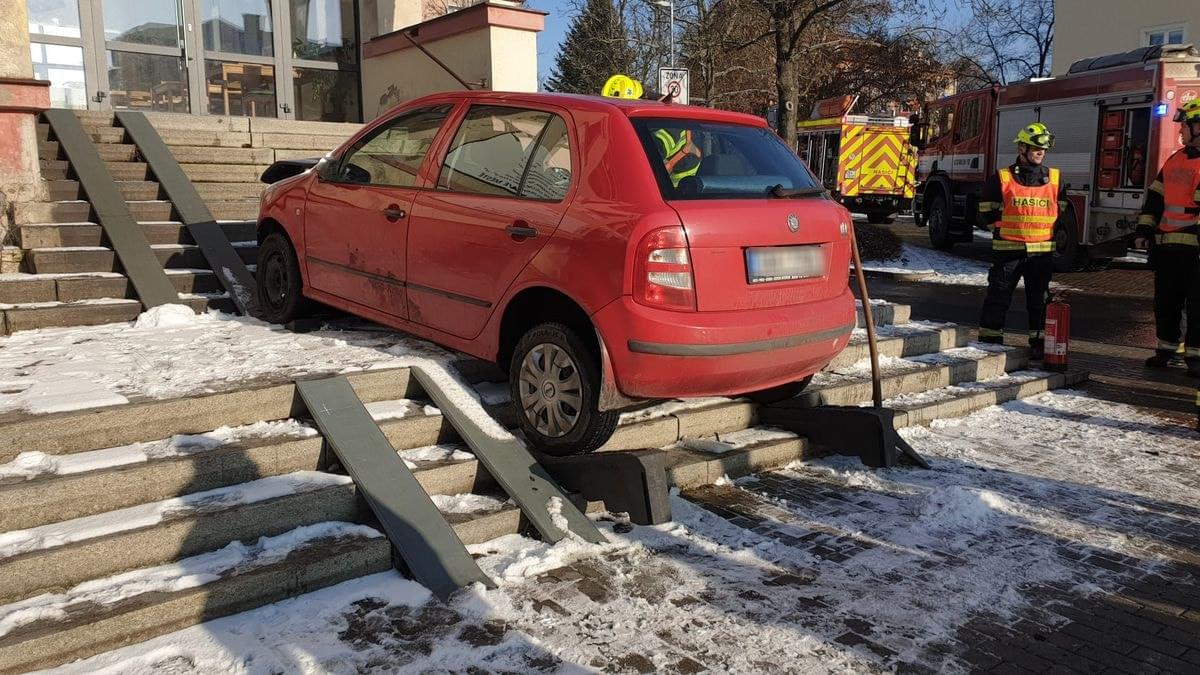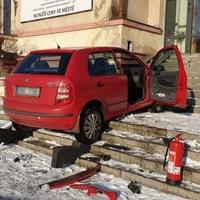 K poněkud kuriózní dopravní nehodě došlo včera dopoledne v Ostrově, kde po střetu s jiným vozem skončila Škoda Fabia až na schodech domu Družba ležícího u místního kulturního domu.