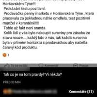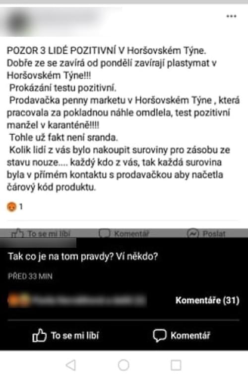Na začátku týdne jsme informovali o tom, že mnoho obyvatel Horšovského Týna vyděsila zpráva uveřejněná na sociální síti. Pisatel v ní uvádí, že nejenže v Horšovském Týně jsou již tři lidé pozitivní na koronavirus, ale hlavně, že prodavačka Penny Marketu, která pracovala za pokladnou a tedy se dotýkala potravin, náhle omdlela a její test na koronavirus byl také pozitivní, čímž nakazila všechny zákazníky a veškeré prodané zboží také kontaminovala. Zpráva se samozřejmě rychlostí blesku šířila mezi lidmi a vyvolala zděšení i paniku.