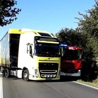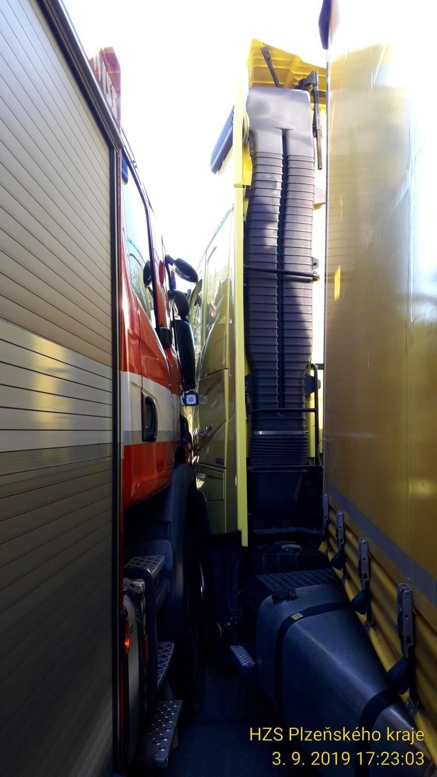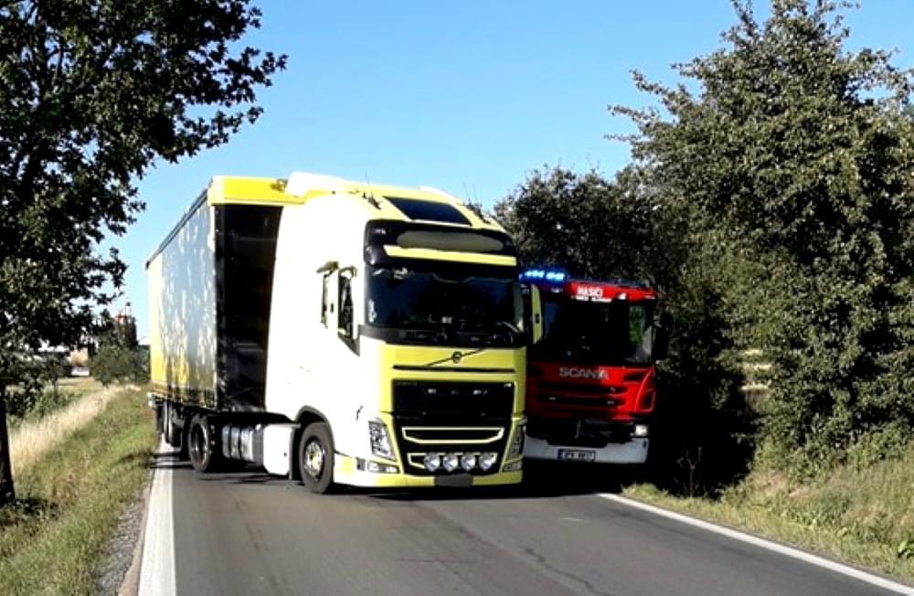 Cestou k záchraně mužů v převráceném autě hasiče ze silnice málem vytlačil kamion