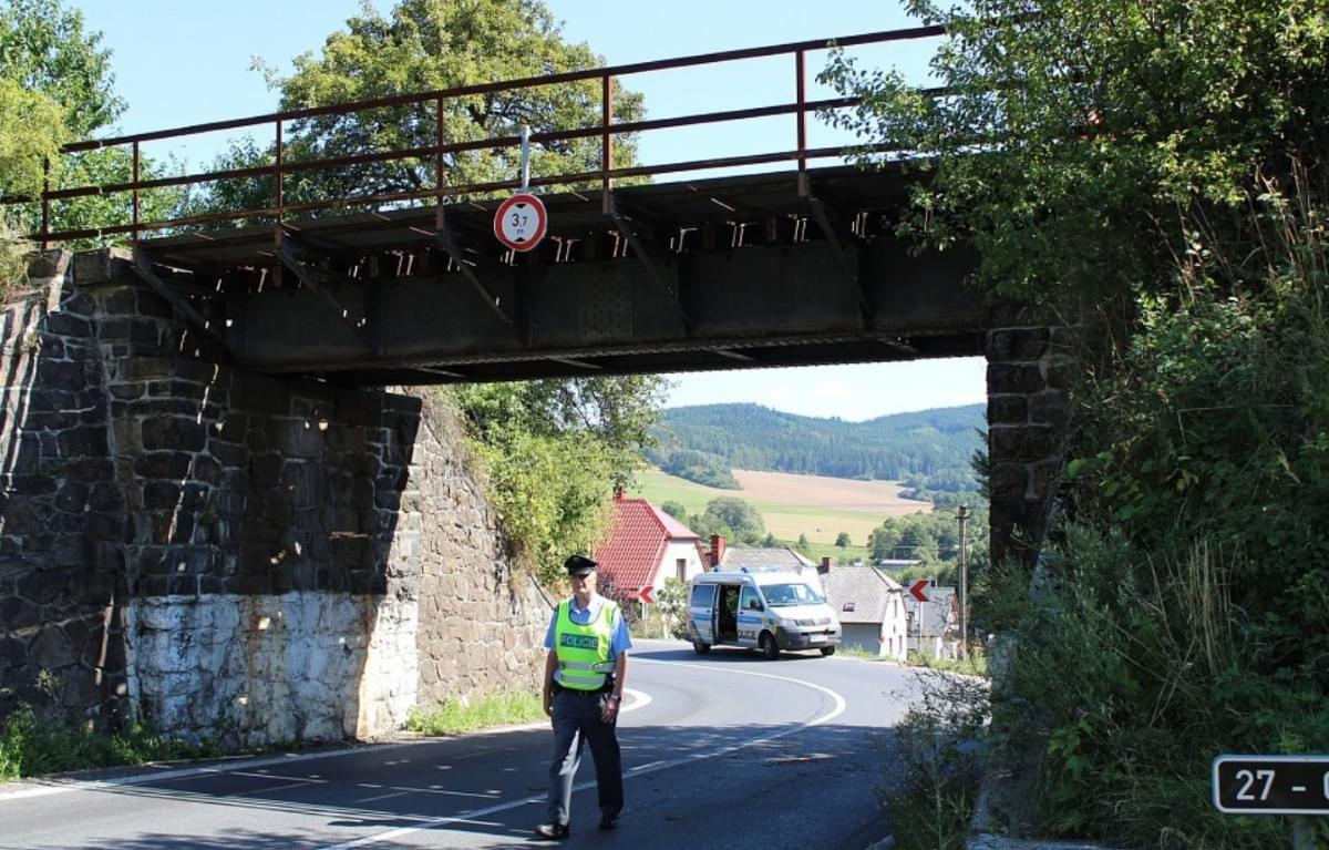 Včera dopoledne v Běšinech nerespektoval mladý řidič dopravní značku s vyznačenou výškou mostu a s nákladním vozidlem Scania s připojeným přívěsem naloženým dřevní kulatinou vjel pod železniční viadukt. Náraz byl tak silný, že došlo k částečnému vychýlení železné konstrukce.