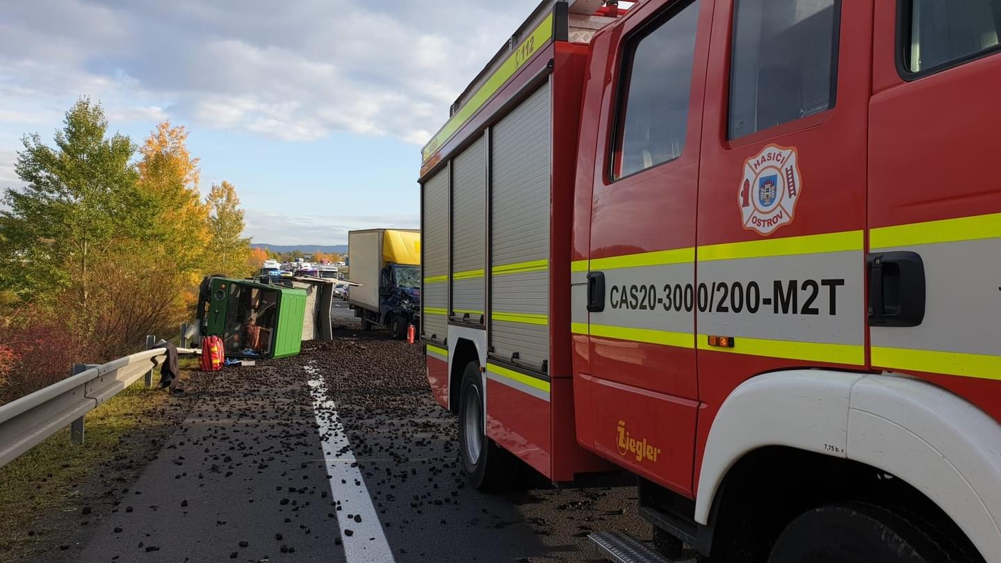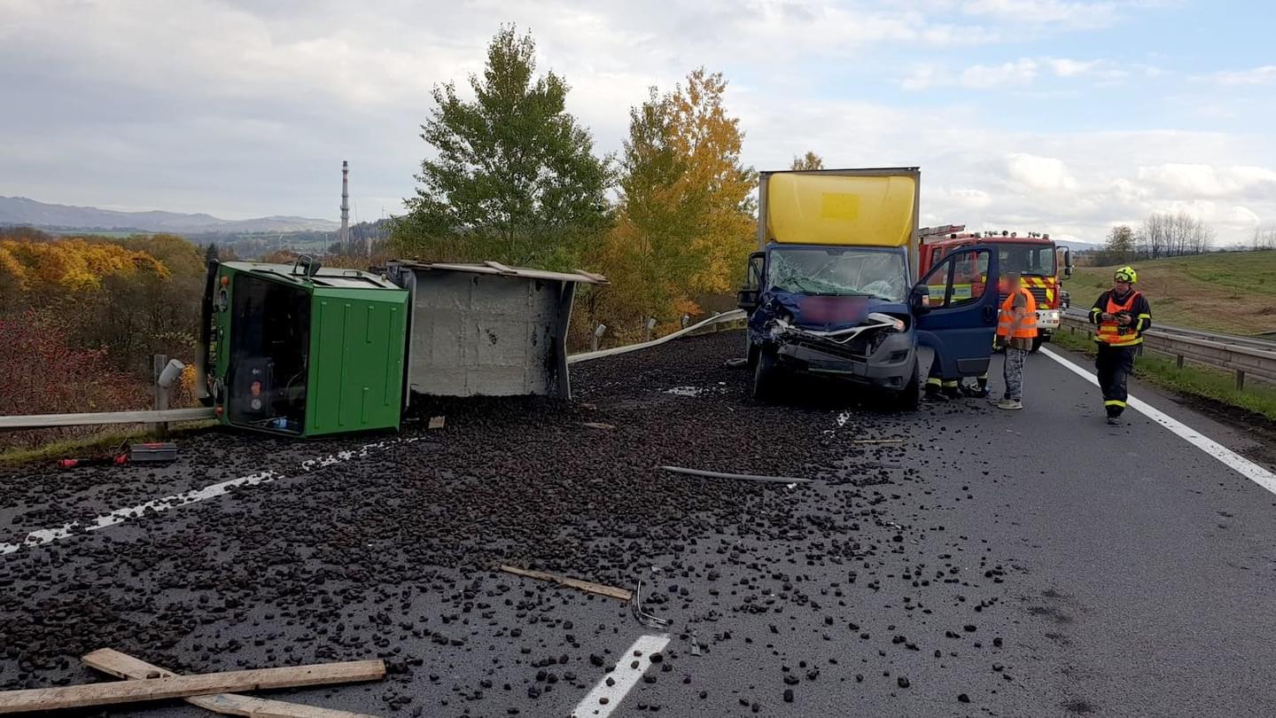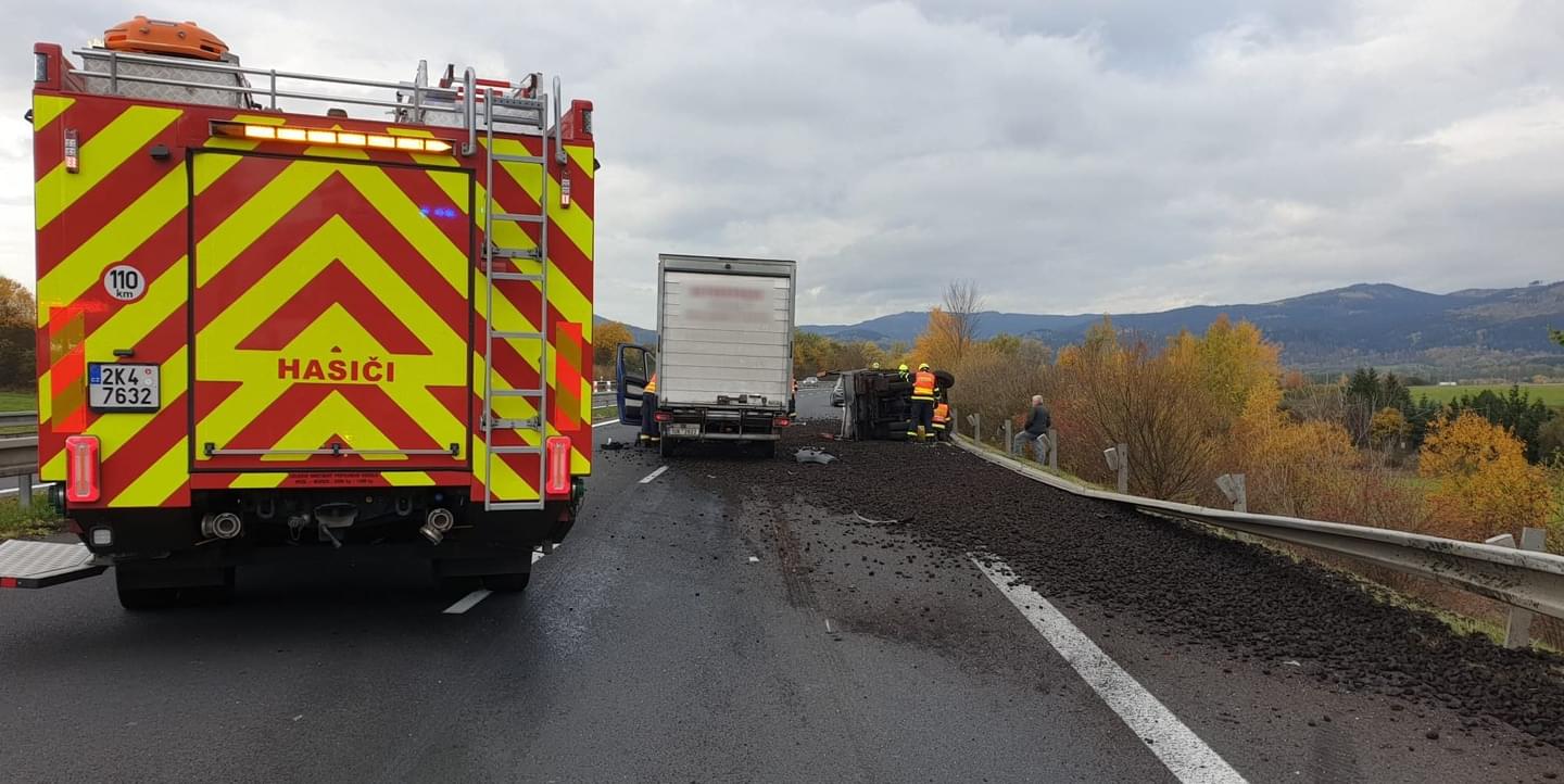 Hasiči ze dvou jednotek mezitím zajistili místo nehody, provedli protipožární zabezpečení a také pomohli s úklidem vysypaného nákladu.