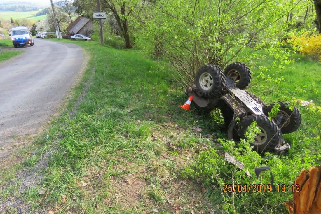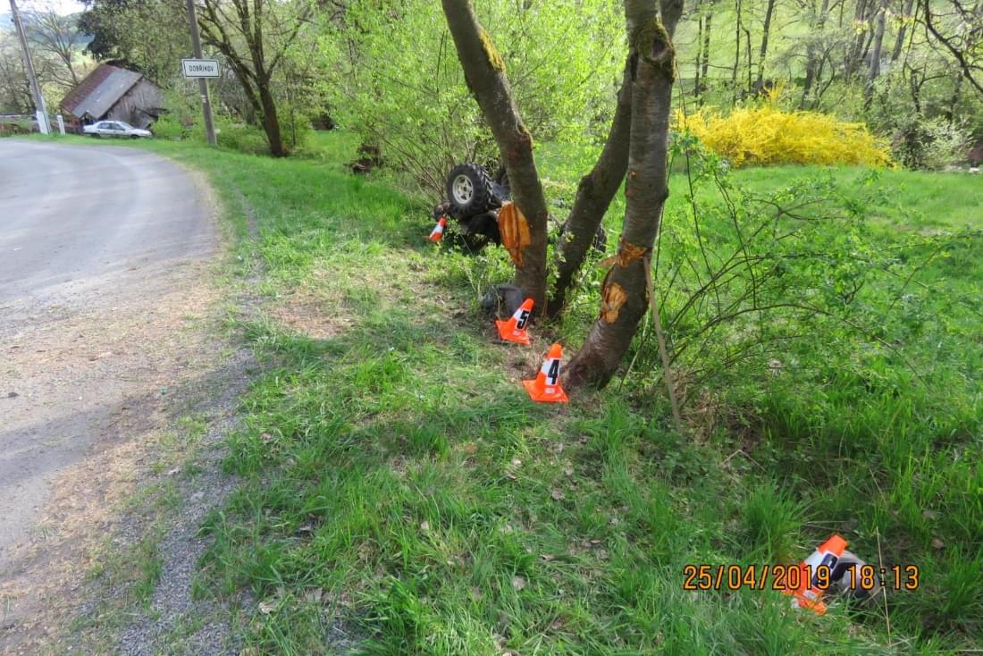 Po páté hodině odpoledne jel řidič se čtyřkolkou Camoto a při sjíždění klesání v levotočivé zatáčce nepřizpůsobil rychlost, vyjel vpravo mimo silnici, kde pravou stranou čtyřkolky zachytil o sloup veřejného osvětlení a poté narazil do dvou třešní rostoucích v silničním příkopu.