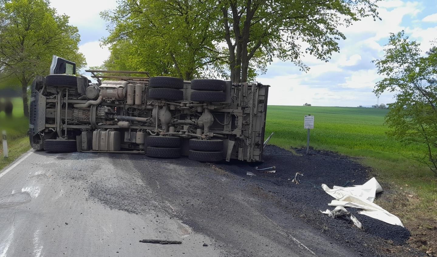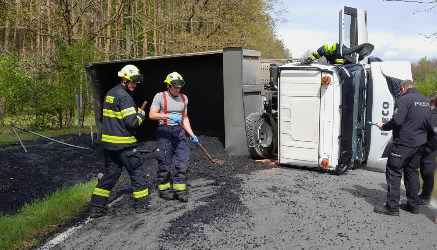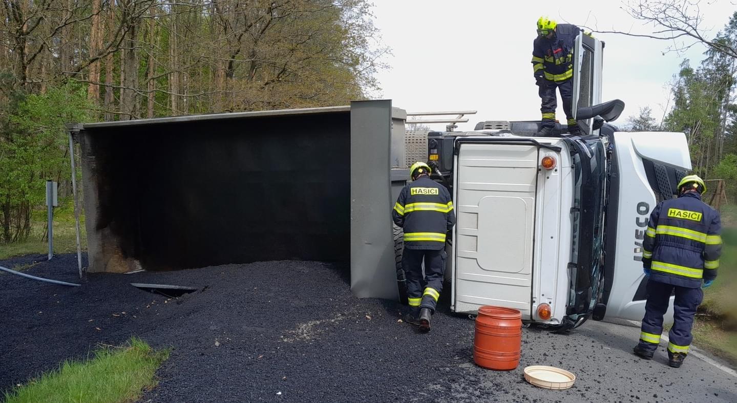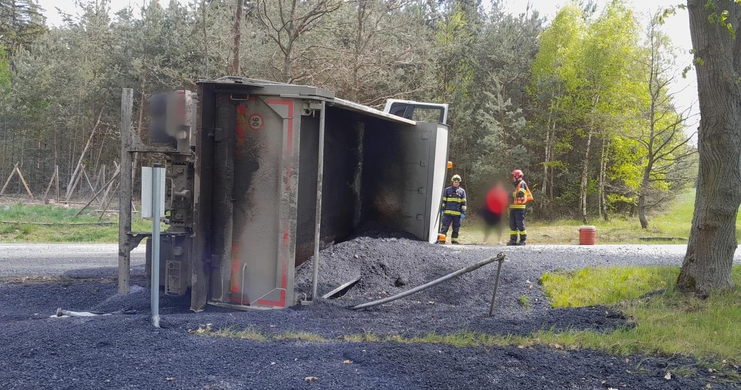 Dnes před jednou hodinou odpoledne došlo na silnici II/183 na Domažlicku u Poděvous k dopravní nehodě, během které se převrátil nákladní vůz s asfaltem.