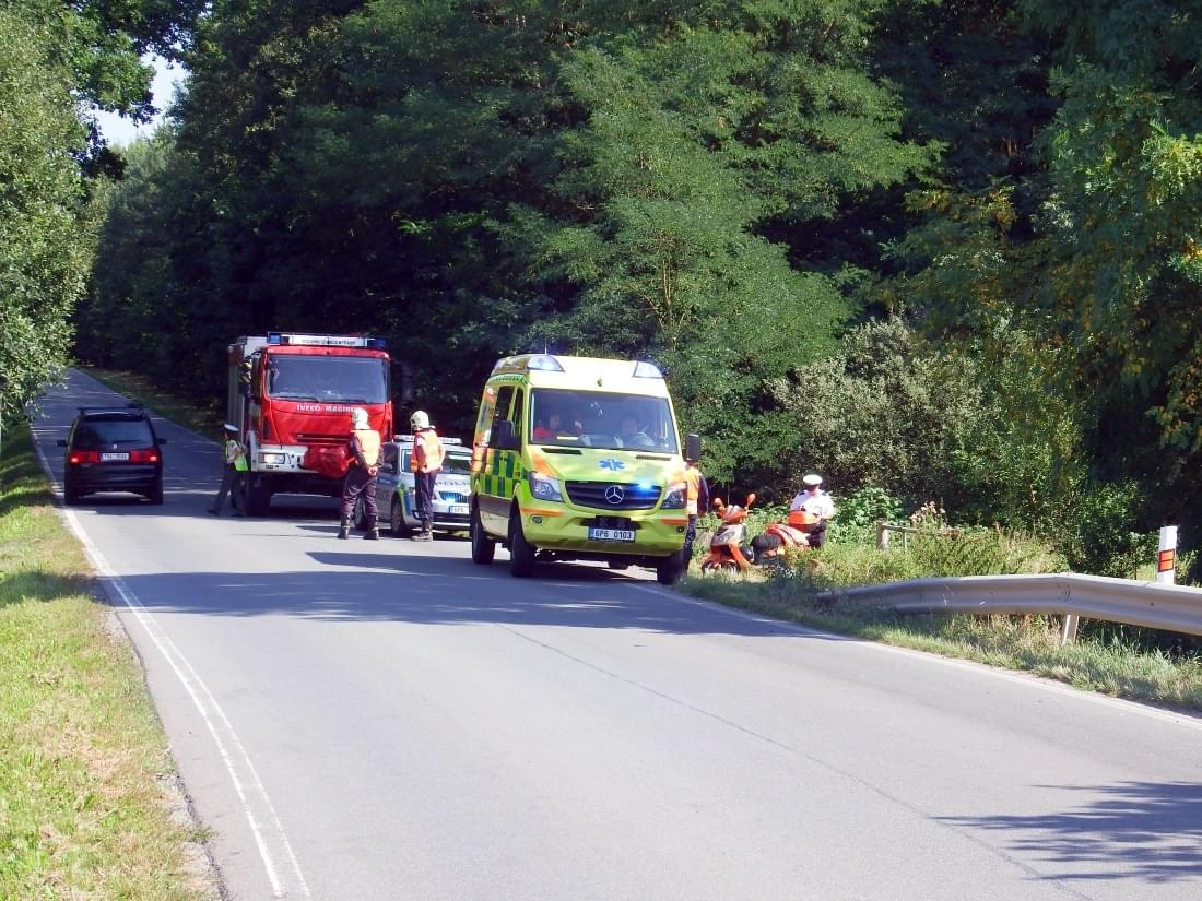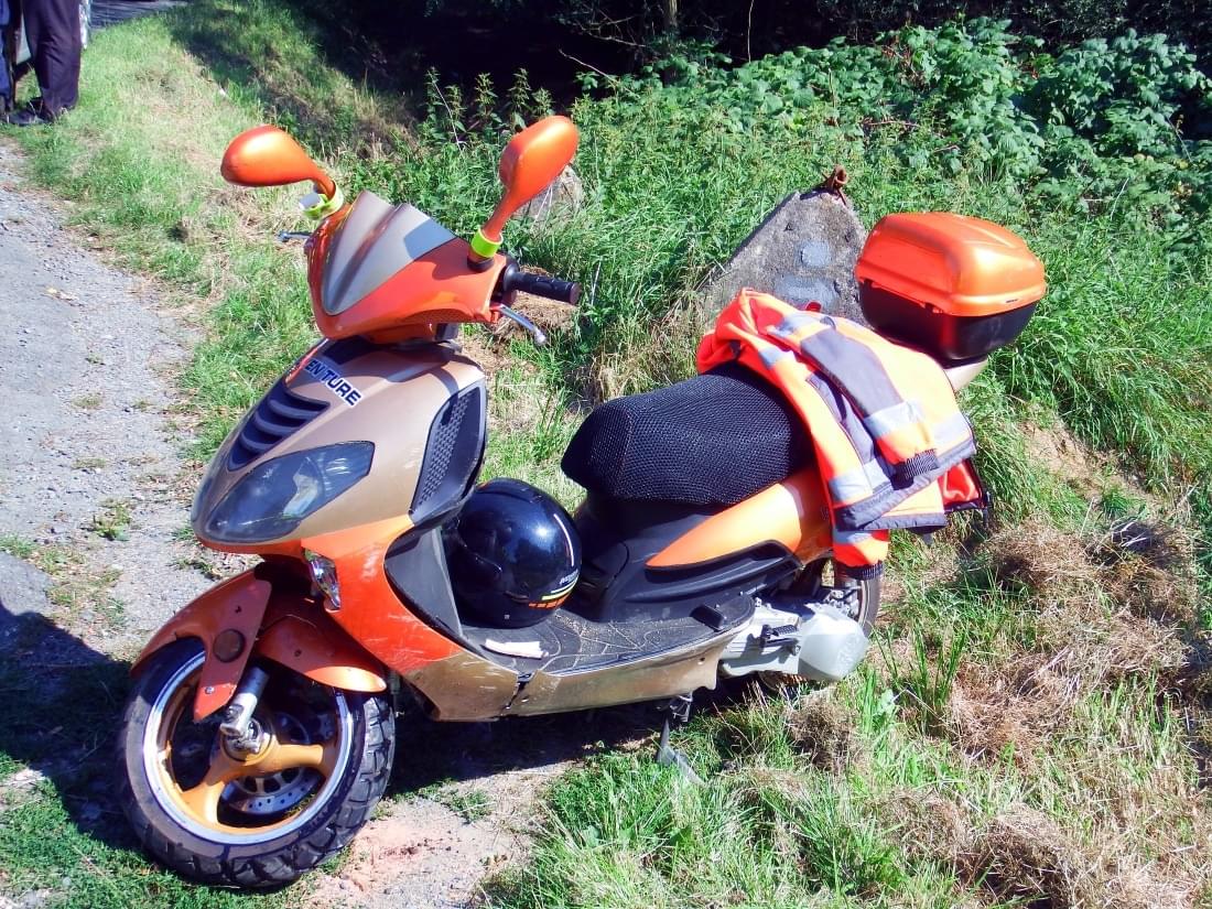 Dnes před třetí hodinou došlo u Vejprnic k havárii skůtru. Muž jel ve směru od Vejprnic na Lesní zátiší a ze zatím nezjištěných příčin vyjel vpravo mimo komunikaci, kde narazil do svodidel a spadl.