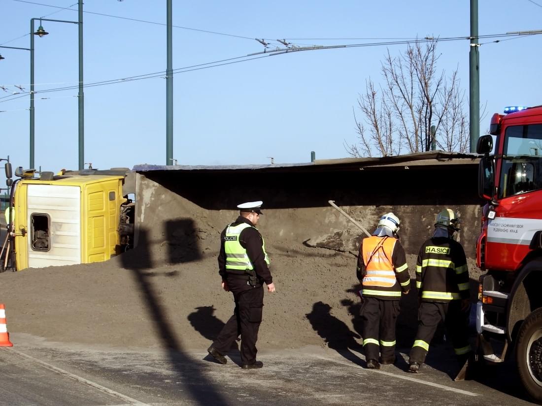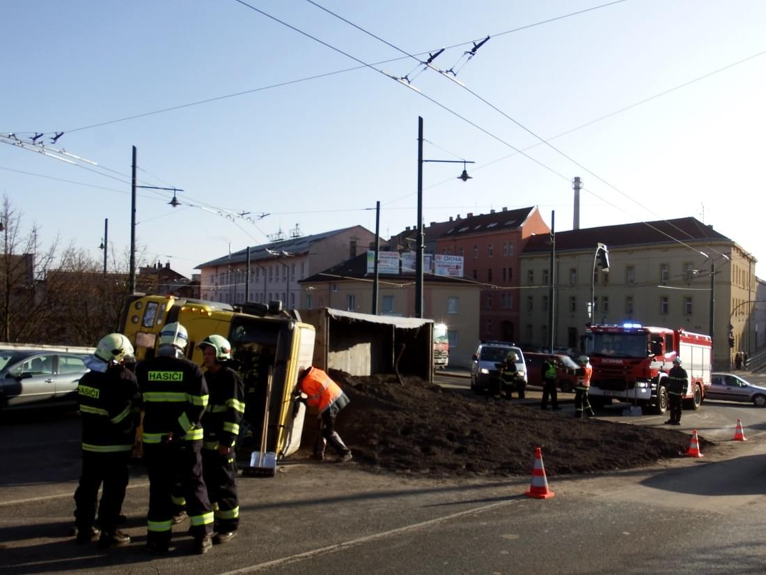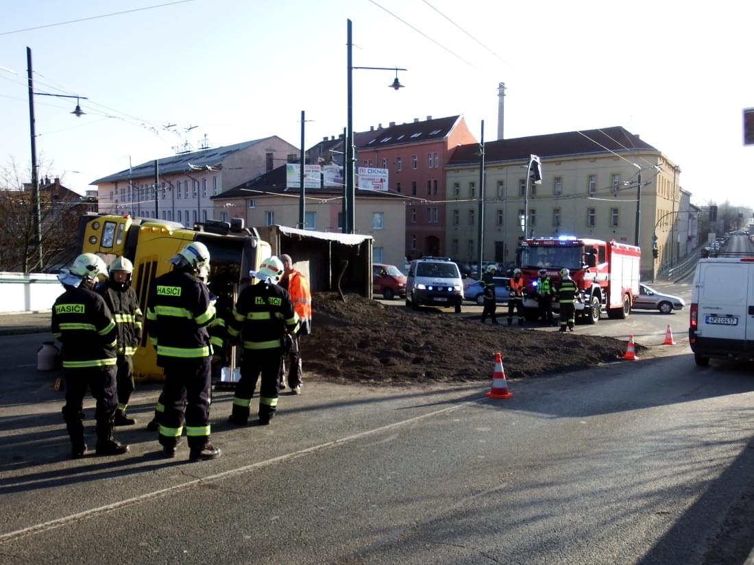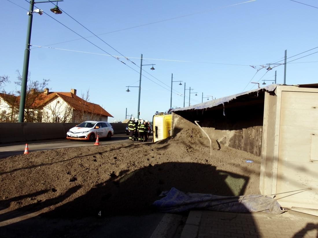 K havárii nákladního vozu došlo dnes před desátou hodinou dopoledne na nájezdu na most přes železniční trať v Lobezské ulici, když se nákladní automobil jedoucí ze Železniční ulice a odbočující vpravo na most v zatáčce převrátil na bok. Při havárii se rozsypalo přibližně 29 tun popílku, které nákladní automobil vezl. Řidič zůstal po havárii uvězněn v kabině vozu, ale podle našich informací neutrpěl zranění. Na místě zasahují hasiči i policisté.