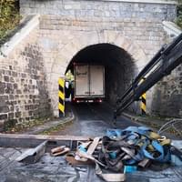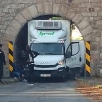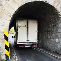 Mladý řidič dle všeho neodhadl výšku vozidla a v takzvané "Myší díře", do které je vjezd povolen pouze vozidlům do výšky 2,5 metru, se pevně zasekl.