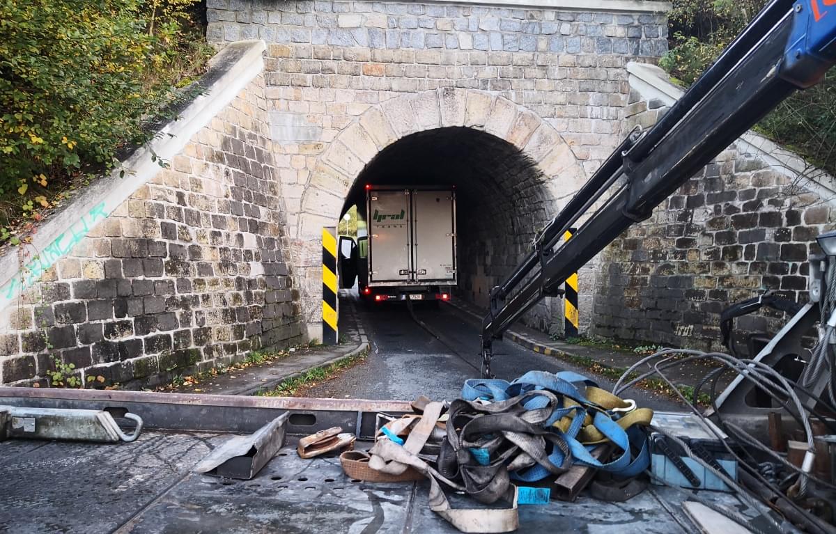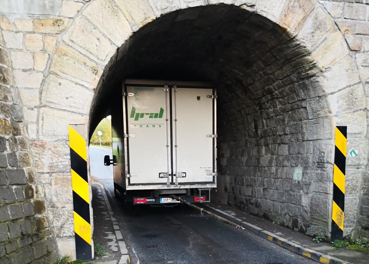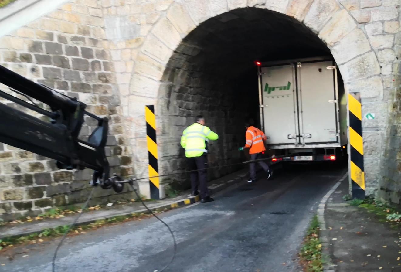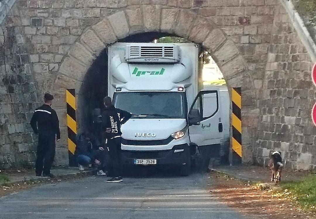 Mladý řidič dle všeho neodhadl výšku vozidla a v takzvané "Myší díře", do které je vjezd povolen pouze vozidlům do výšky 2,5 metru, se pevně zasekl.