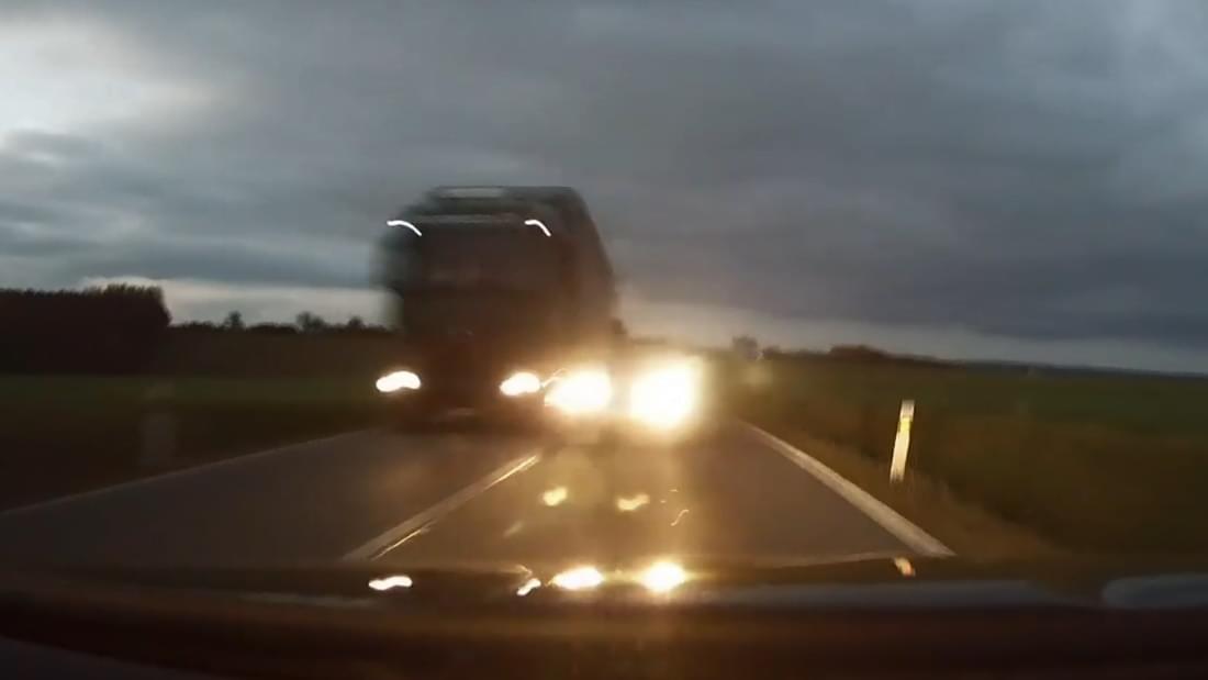 V zatáčce na horizontu, ve které je předjíždění samozřejmě zakázáno, tento řidič při předjíždění kamionu ohrozil protijedoucí vozidlo, jehož řidič, aby zabránil čelnímu střetu, musel strhnout řízení a havaroval proto do silničního příkopu.