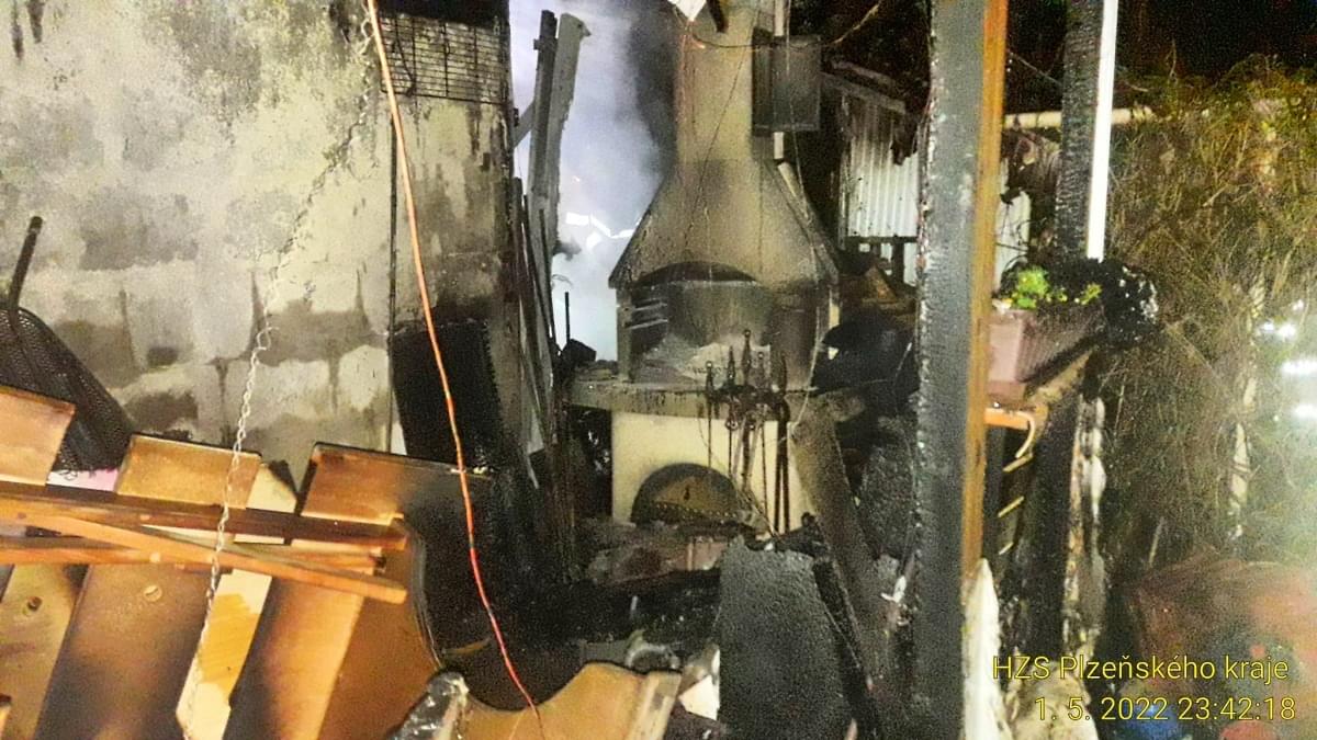 Jen o hodinu později hasiči vyjížděli do Trnové, kde došlo k požáru pergoly u rodinného domu. Než se hasičům pomocí dvou "C" proudů podařilo požár lokalizovat a uhasit, došlo i k poškození fasády domu.