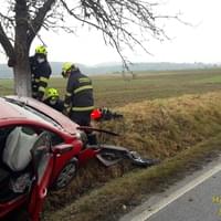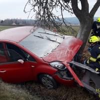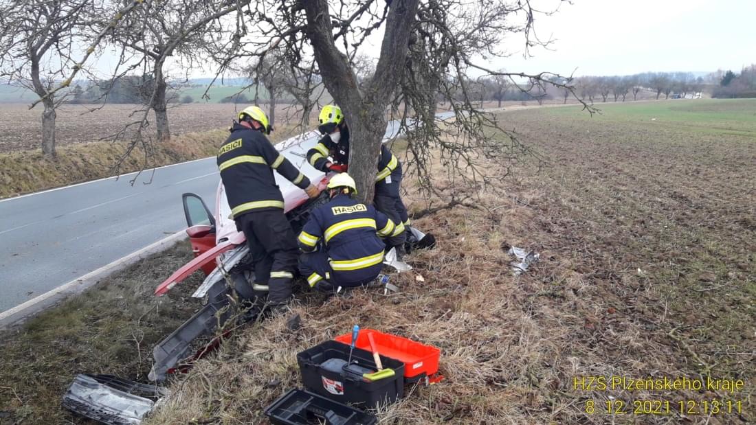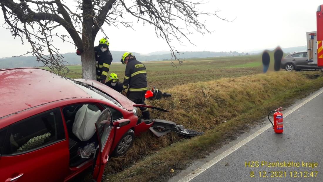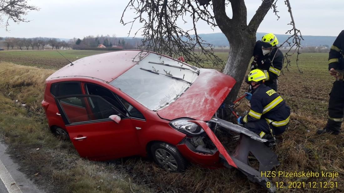 Dnes před polednem došlo na silnici č.19/I mezi Nezvěsticemi a odbočkou na Šťáhlavice nedaleko čerpací stanice a hřbitova k havárii osobního vozu do stromu.