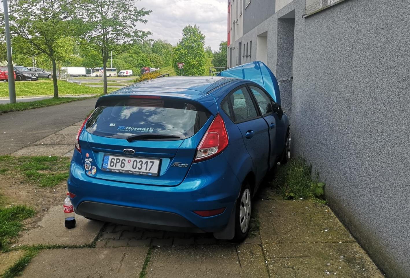 Dnes odpoledne před jednou hodinou došlo v Plzni v Hodonínské ulici ke kuriózní dopravní nehodě. Mladá žena vyjížděla z parkoviště obchodu Albert, nezvládla řízení a i s vozem skončila přímo v zadním vchodu protějšího domu.