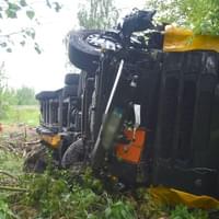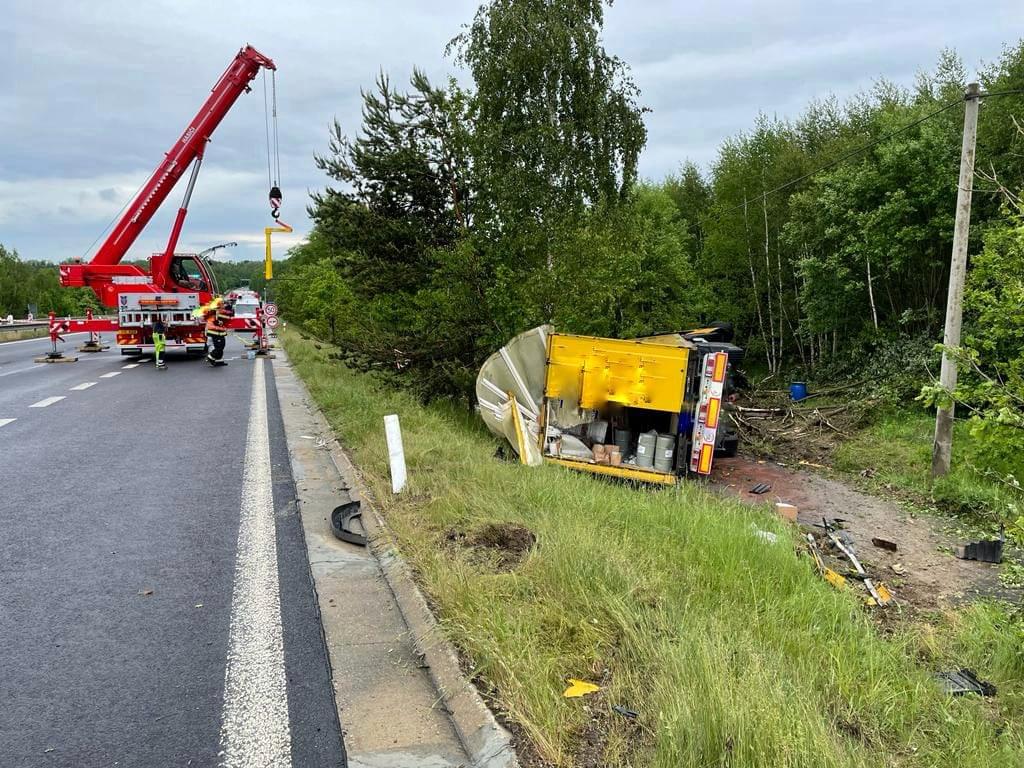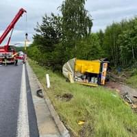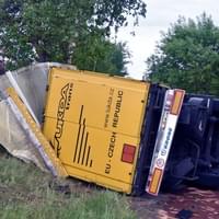 Na silnici I/6 ze Sokolova na Schirnding u odbočky na Pomezí nad Ohří došlo dnes v ranních hodinách ke střetu osobního vozu s kamionem, převážejícím mimo jiné i nebezpečné látky. Kamion se po střetu převrátil na bok a zůstal ležet mimo vozovku pod mírným svahem.