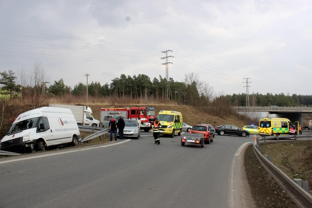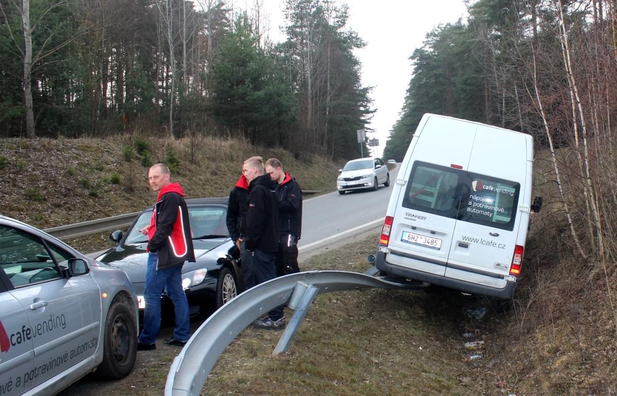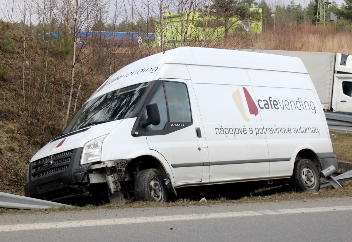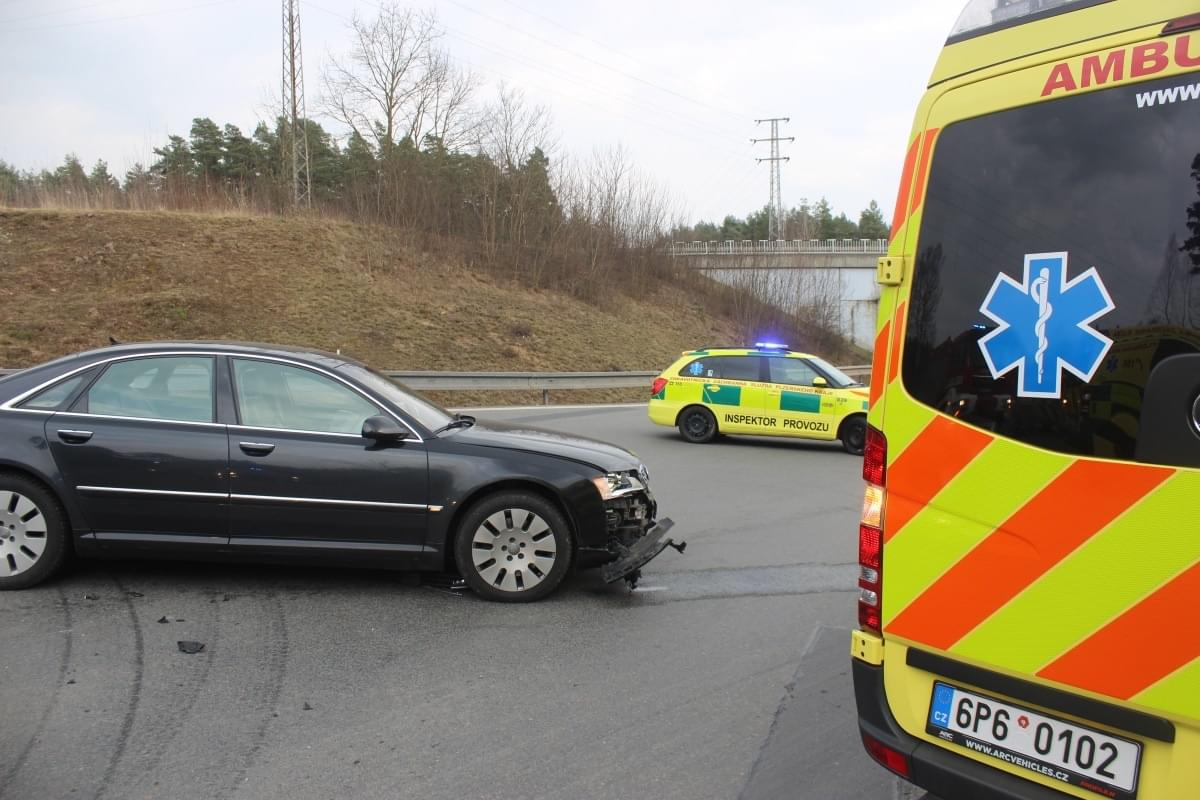 Na sjezdu z přivaděče 26 na Vejprnice došlo ve čtvrt na čtyři odpoledne ke střetu dodávky Ford Tranzit a osobního automobilu Audi. Náraz dodávku vymrštil na svodidla, na kterých zůstala viset nad příkopem.