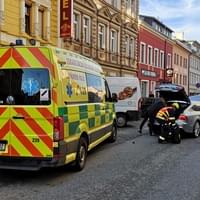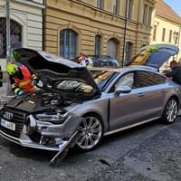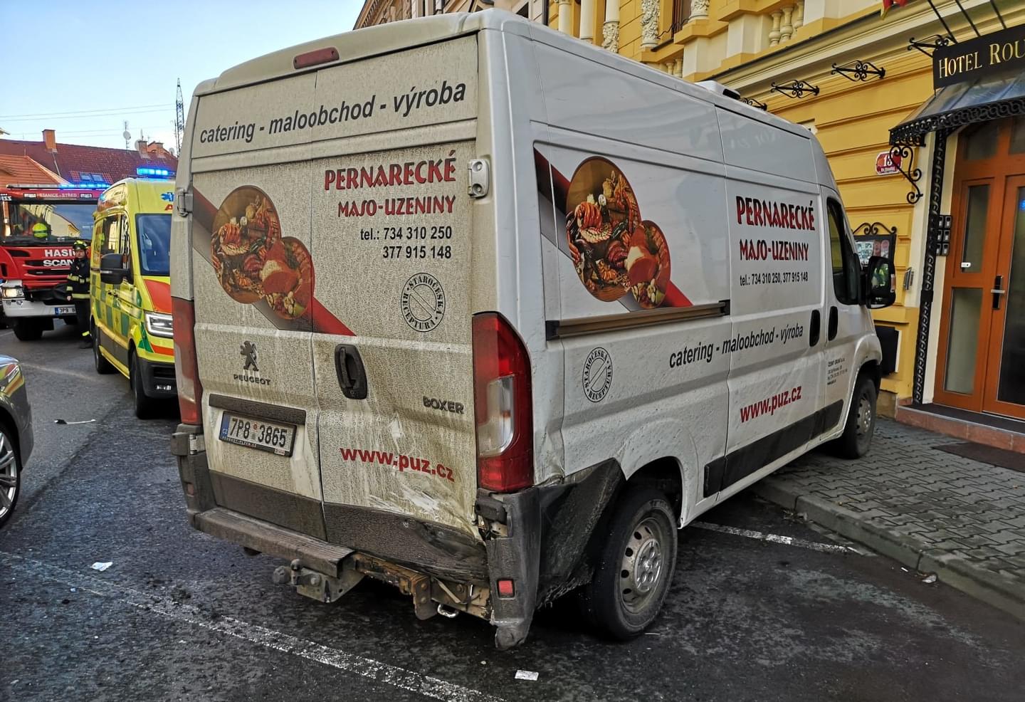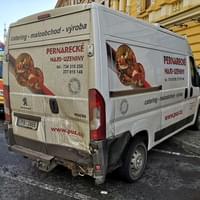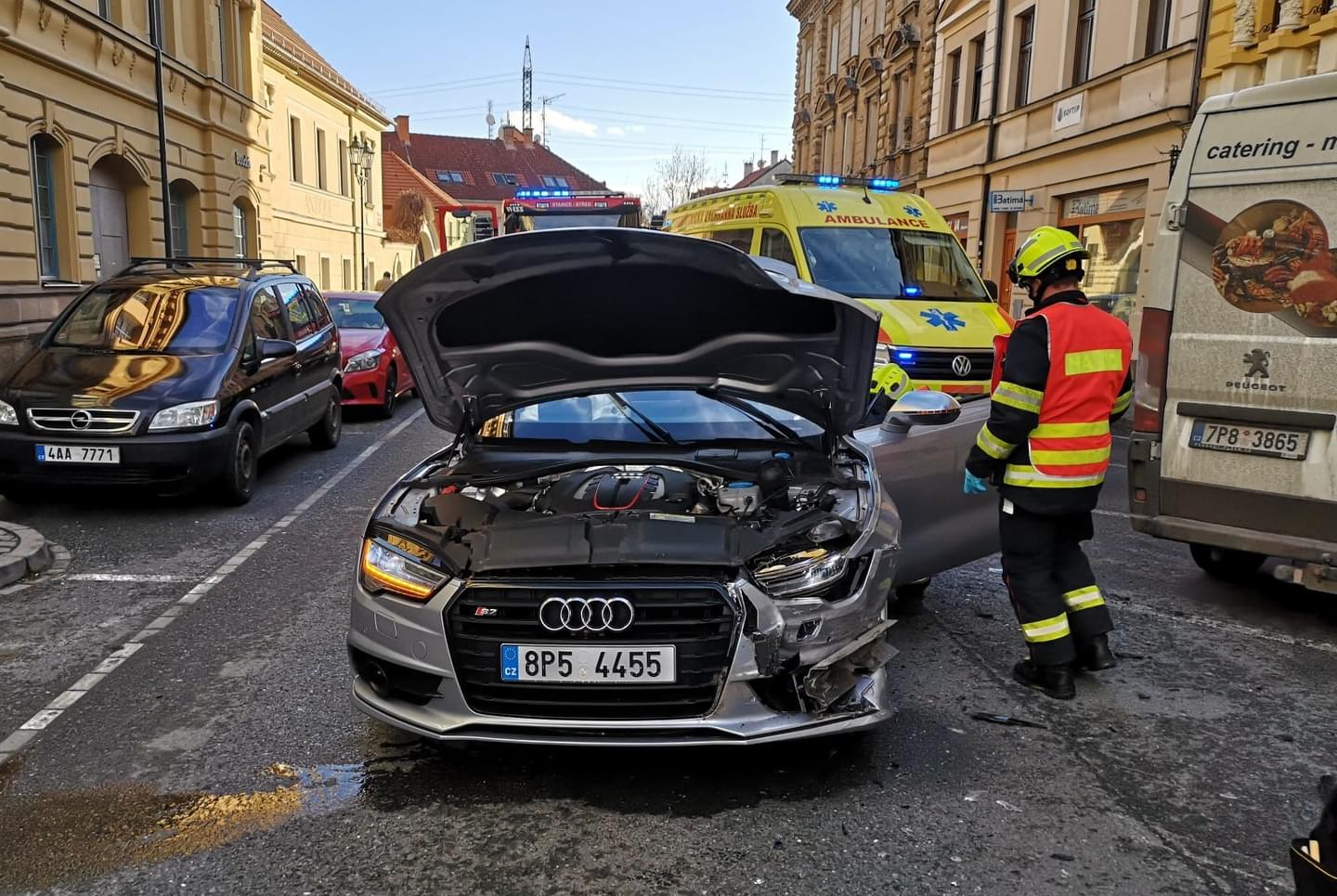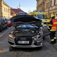 Dnes po druhé hodině došlo v ulici Na Roudné v Plzni k dopravní nehodě, při které podle svědků vůz Audi narazil do zaparkované řeznické dodávky Peugeot Boxer. Náraz byl tak silný, že dodávku odhodil na chodník a otočil do protisměru.