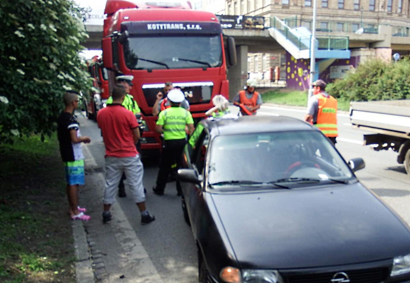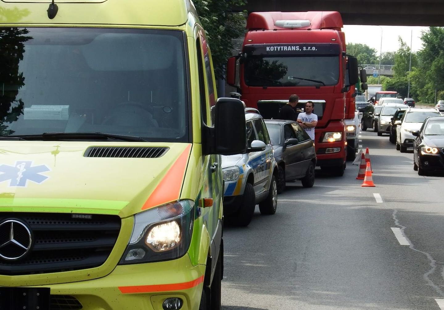 Policisté nehodu šetří, je blokován jeden jízdní pruh a ve směru od Plazy vznikají dlouhé fronty vozidel.