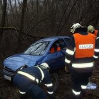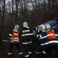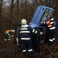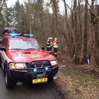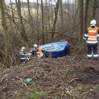 Osobní auto řízené ženou vyletělo ze silnice, sjelo ze srázu a nacházelo se na boku cca 4 metry od komunikace. Ve vozidle cestovaly dvě osoby. Řidičku transportovali záchranáři do nemocnice, spolujezdec vyvázl bez zranění. Z vozidla odkapávaly pohonné hmoty.