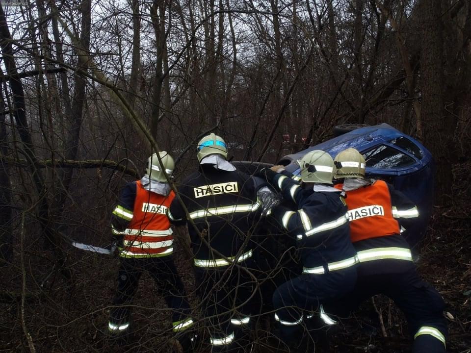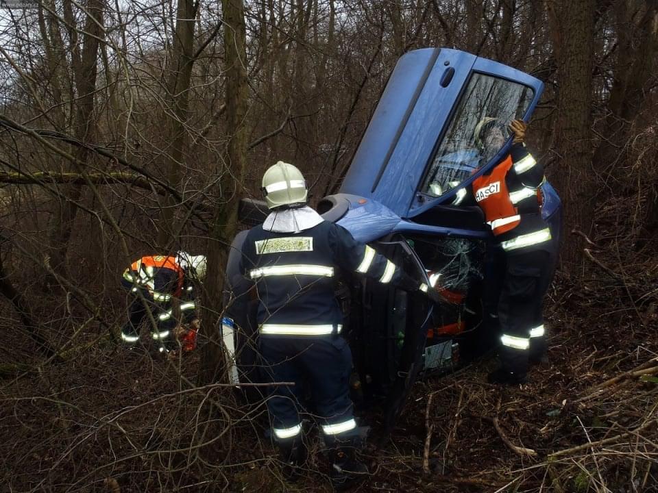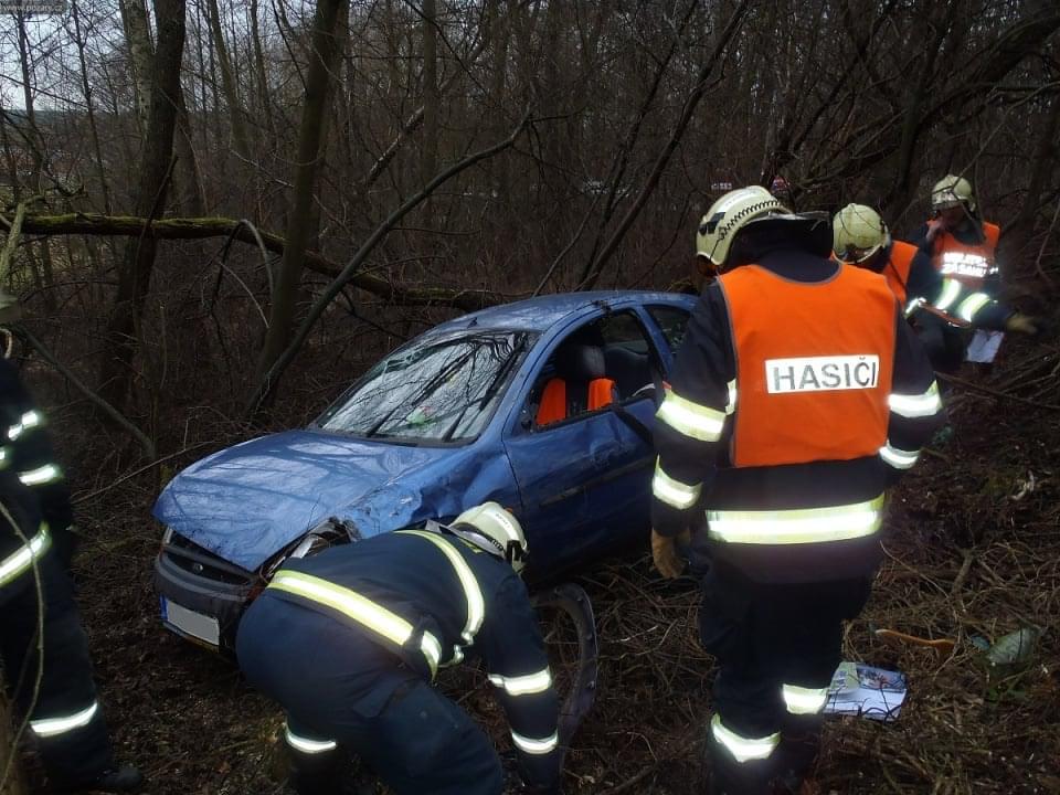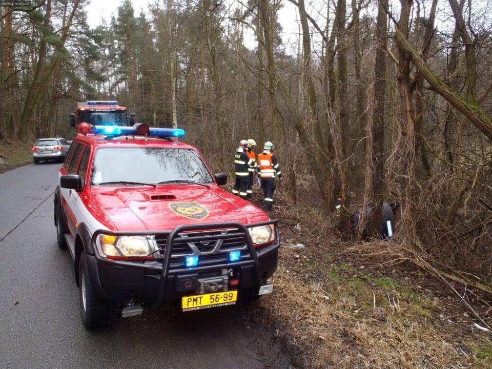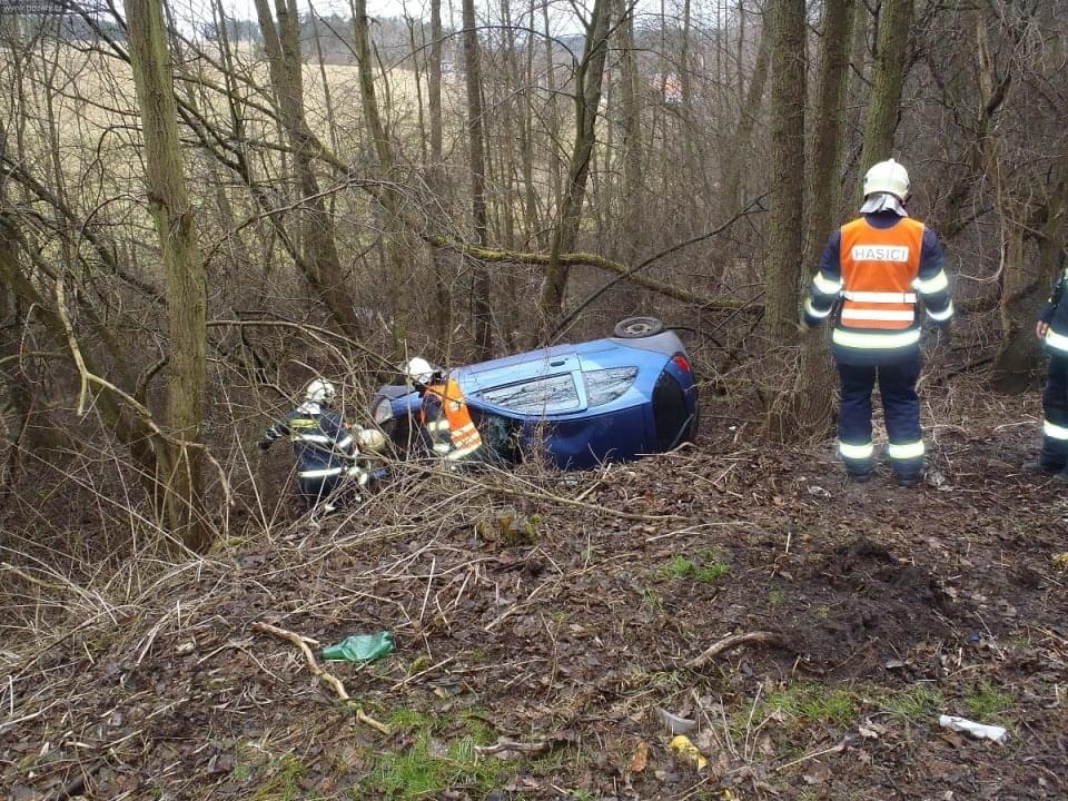 Osobní auto řízené ženou vyletělo ze silnice, sjelo ze srázu a nacházelo se na boku cca 4 metry od komunikace. Ve vozidle cestovaly dvě osoby. Řidičku transportovali záchranáři do nemocnice, spolujezdec vyvázl bez zranění. Z vozidla odkapávaly pohonné hmoty.