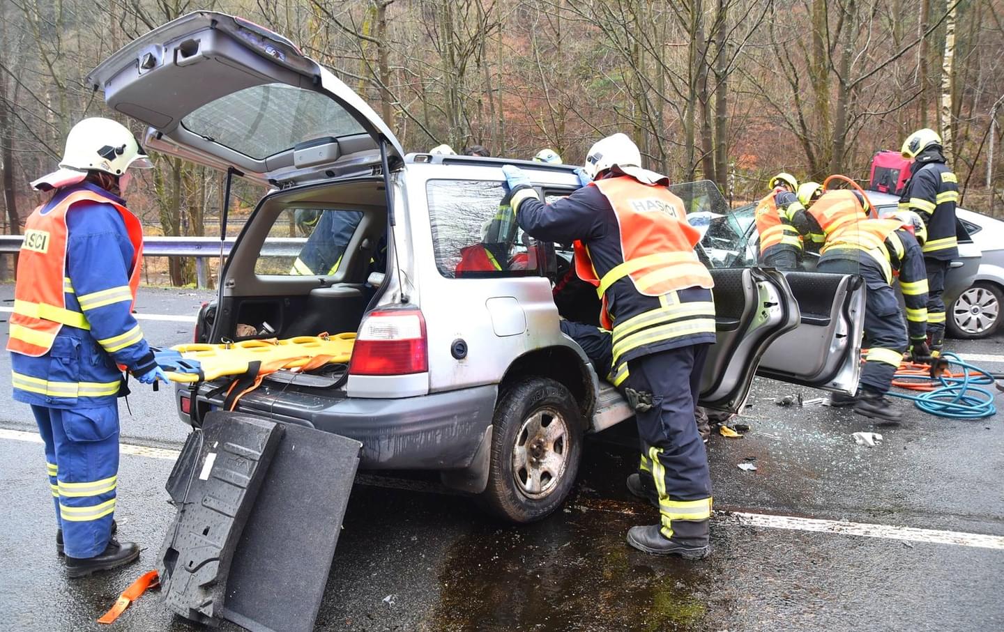 Hasiči zajistili místo události, provedli protipožární opatření a z jednoho vozu museli řidiče vyprostit pomocí hydraulických nástrojů.